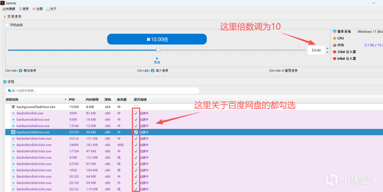 1、打开后,在进程列表里找到百度网盘并勾选,加速倍率调到 10 倍 即可。