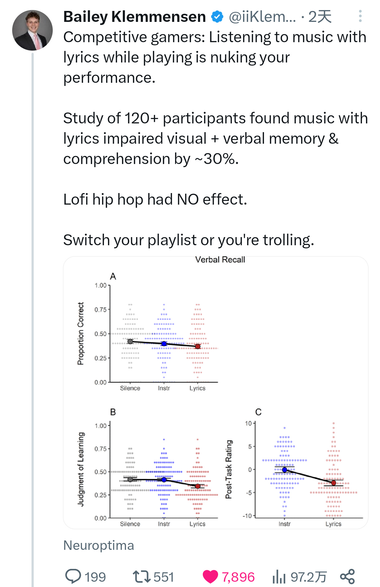 2月12日,神经科学与竞技表现优化专家Bailey Klemmensen (iiKlemm) 在推特发布的一条硬核科普引起了电竞玩家的关注