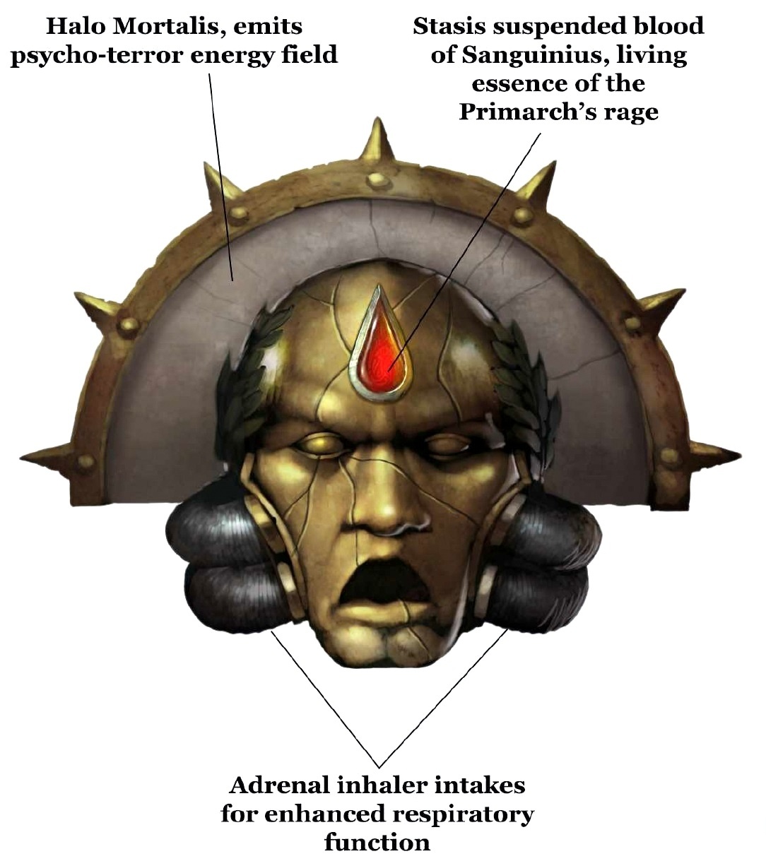 金色面具按原体面容打造,是圣血天使至高象征;内置铁光环产生灵能偏转立场,战斗中会浮现金色能量光晕,震慑敌军。