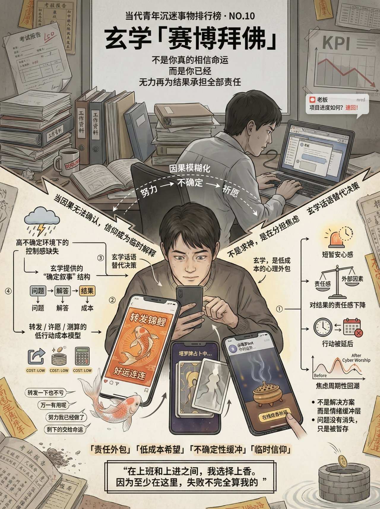 - 转发锦鲤、求签问卜、对着塔罗牌许愿,用玄学对抗不确定性。