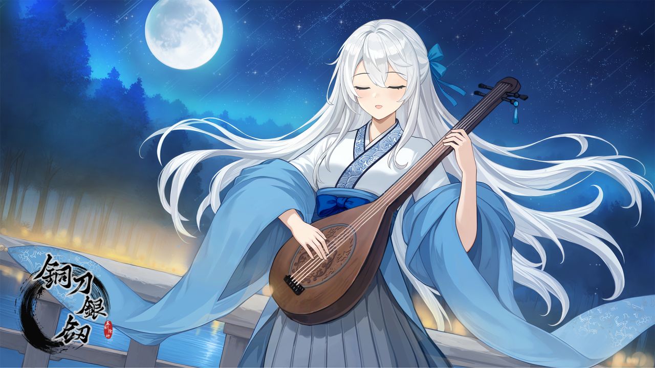 璀璨的月华下,还带着几分稚气的歌女忽然转过身来,背对着皎月和幽湖,奏起了古朴而动人的乐曲。