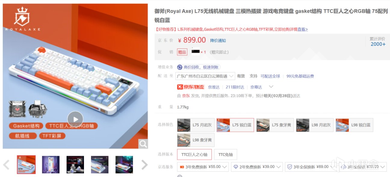 L75 为御斧的旗舰级 75 配列键盘,所搭载的巨人之心轴和兔轴都是 TTC 的高价轴,二手单价均在 3 块以上,而配置上三模无线、热插拔、RGB 背光、夹心硅胶、底垫等都没有落下,在右上角还设计有一个 TFT 显示屏,可以显示电量、连接模式等信息,也可自定义图片,可玩性十足。
