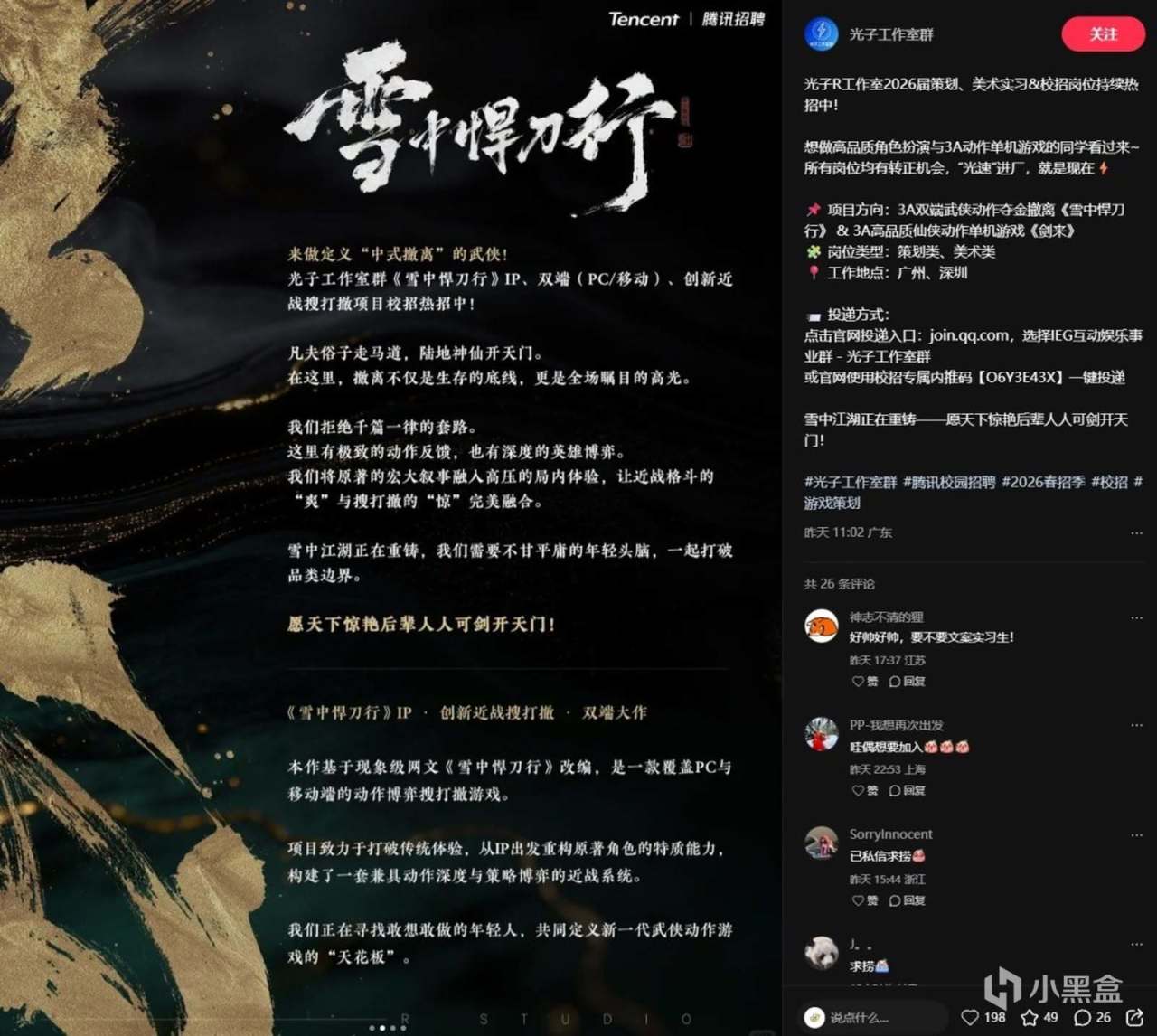 2026年2月中旬,腾讯旗下四大工作室群之一的光子工作室群通过官方招聘渠道正式宣布,已同步立项开发两款基于顶级网络文学IP的3A级游戏新作:双端武侠动作夺金撤离游戏《雪中悍刀行》与仙侠动作单机《剑来》。此举被视为腾讯在国产3A游戏赛道上一次强硬的战略布局,旨在摆脱“吃鸡专业户”标签,抢占高品质游戏研发的话语权。