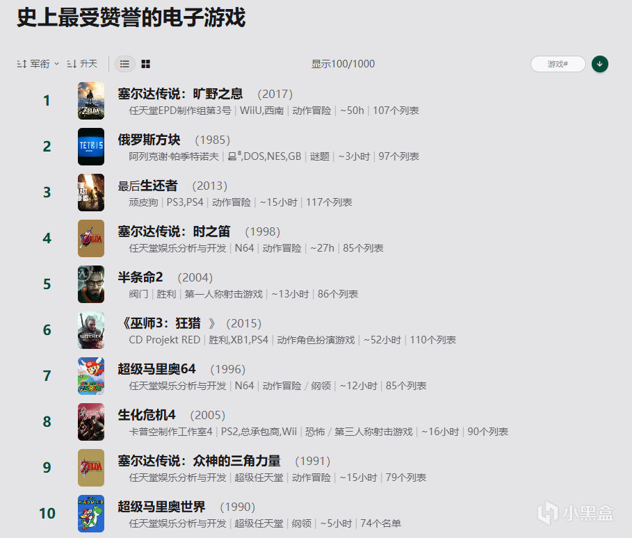 根据统计,排名前十的最受好评游戏依次为:《塞尔达传说:荒野之息》(2017)、《俄罗斯方块》(1985)、《最后生还者》(2013)、《塞尔达传说:时之笛》(1998)、《半条命2》(2004)、《巫师3:狂猎》(2015)、《超级马力欧64》(1996)、《生化危机4》(2005)、《塞尔达传说:众神的三角力量》(1991)和《超级马力欧世界》(1990)。