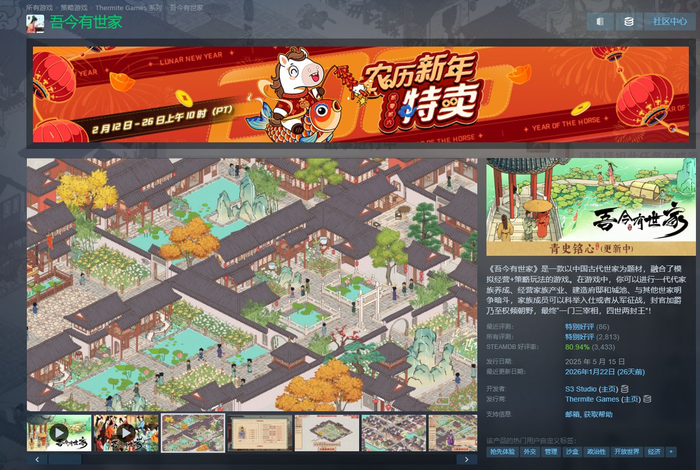 以中国古代世家为题材,融合了模拟经营+策略玩法的游戏