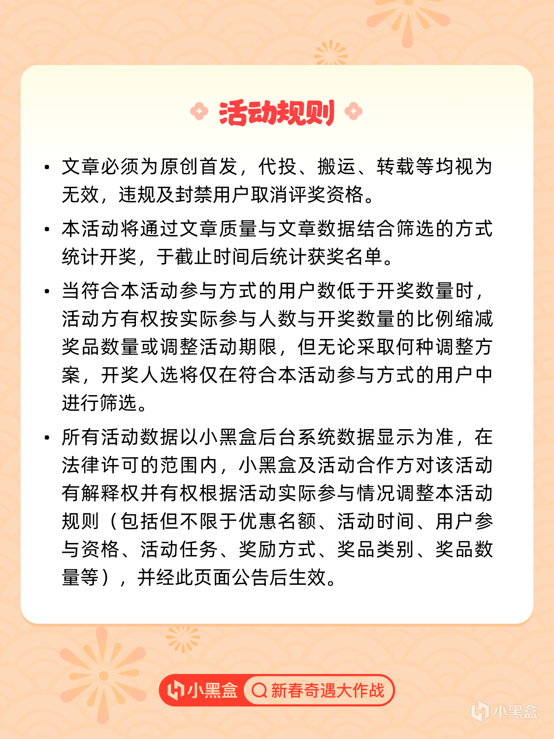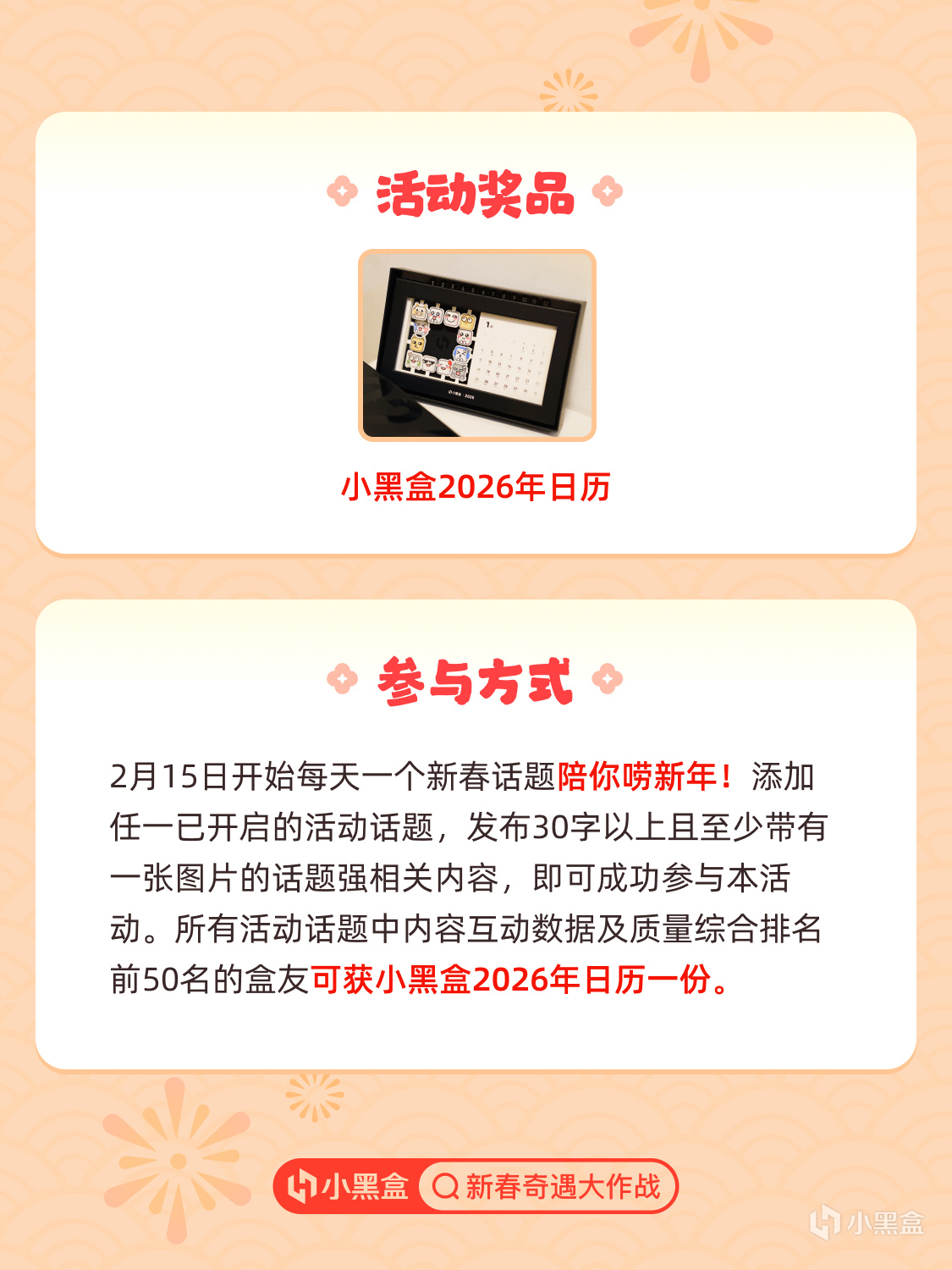 七大新春话题局,2月15日起,每天一个新春话题陪你唠新年!活动期间带任一已开启的活动话题,发布30字以上且至少带有一张图片的话题强相关内容,即可成功参与本活动。所有活动话题中内容互动数据及质量综合排名前50名的盒友可获小黑盒2026年日历一份!