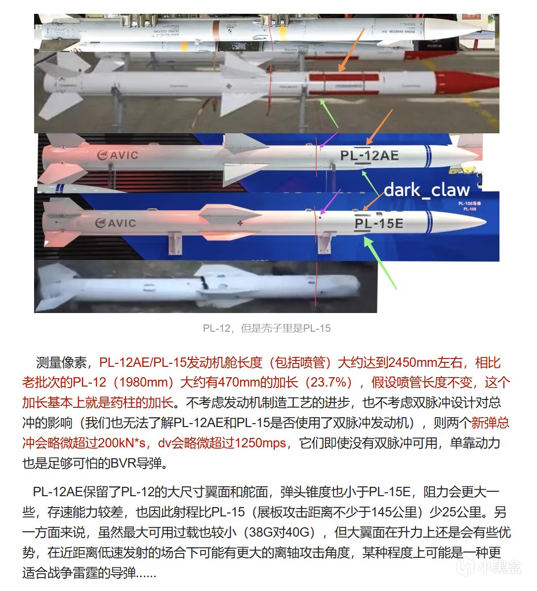 根据官方的微博截图和 SpitfireMkIX 大佬的分析,PL-12AE相比于PL-12更重也更长,这主要是升级了引导头和动力,这意味着PL-12AE不仅会有引导头的大幅增强,动力性能也将有相当的提升,根据推测,PL-12AE拥有超过 200kNs 的总冲和1250m/s的增速,作为对比,目前游戏中动力最强的中距主动弹R-77-1,总冲和增速分别为170.450kN/S和1123.29m/s,而R77-1的阻力显著高于PL-12AE