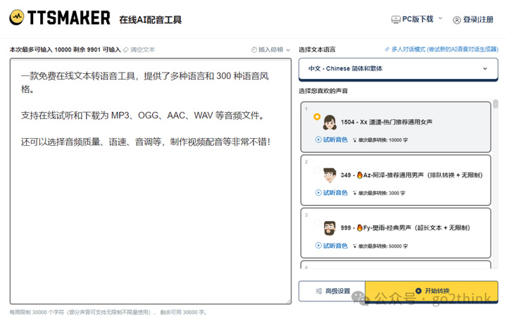 一款免费在线文本转语音工具,提供了多种语言和 300 种语音风格。