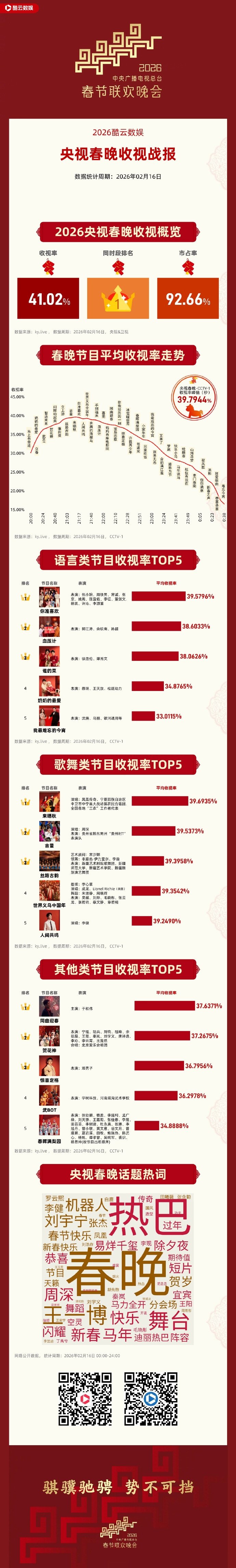 2026年央视总台春晚收视率整体收视率达41.02%(央视&卫视)市占率92.66%。