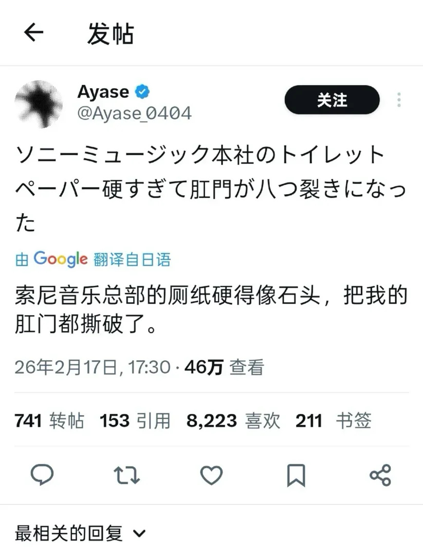 今日,知名音乐人Ayase,即为Yoasobi成员之一,发文称索尼音乐总部的厕纸太硬,竟把他的肛门都擦破了!