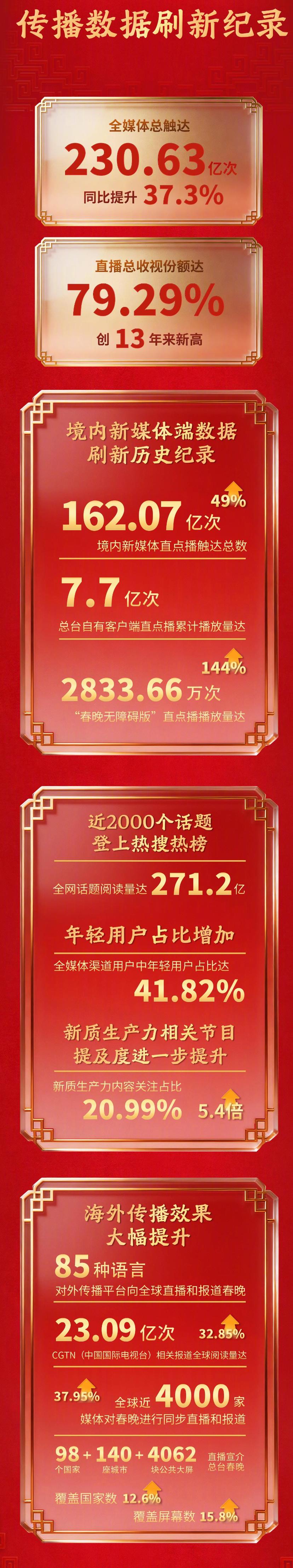 春晚播出期间,平均每分钟同时在线收看/收听人数3.25亿人,同时在线收看人数峰值破4亿人。