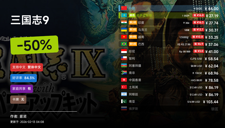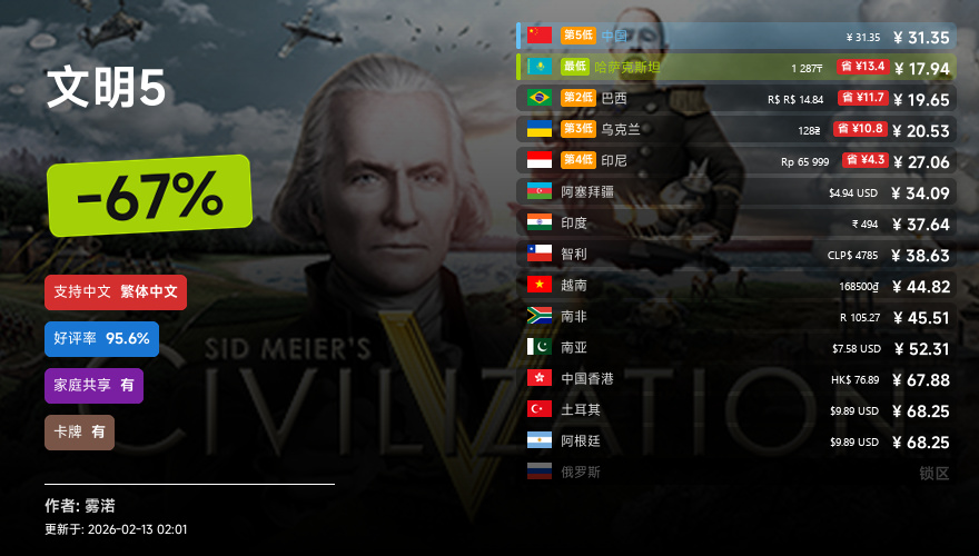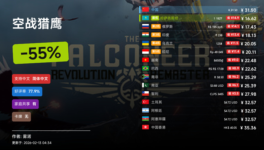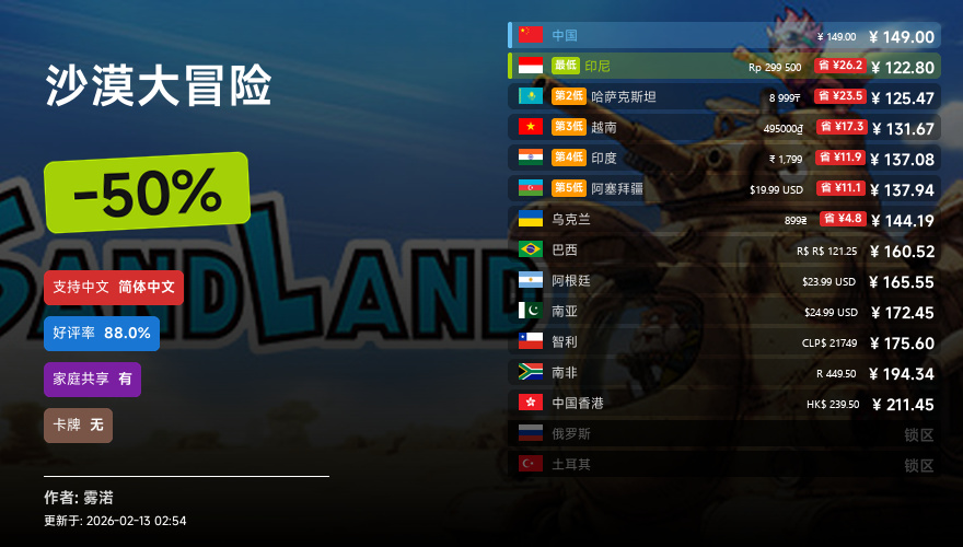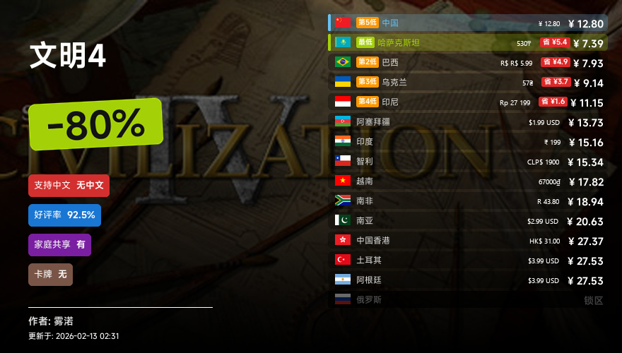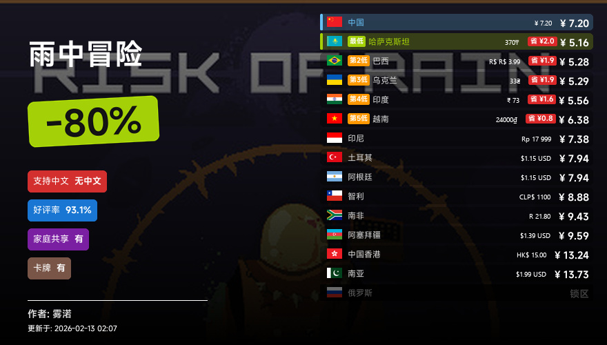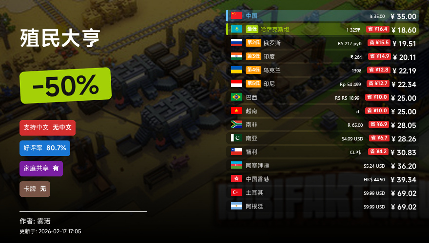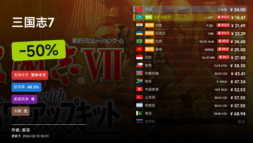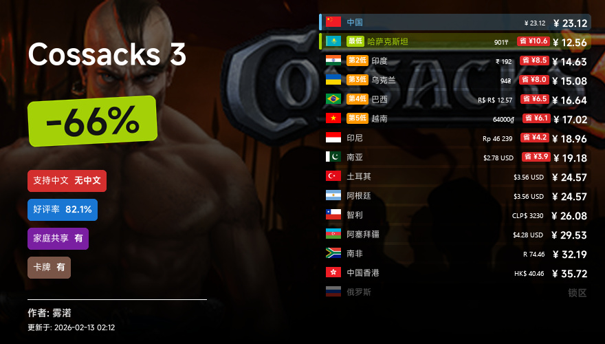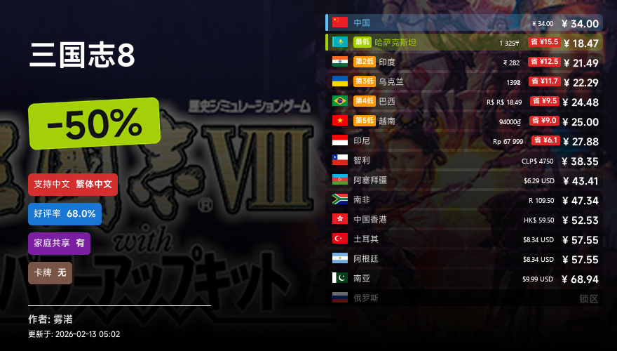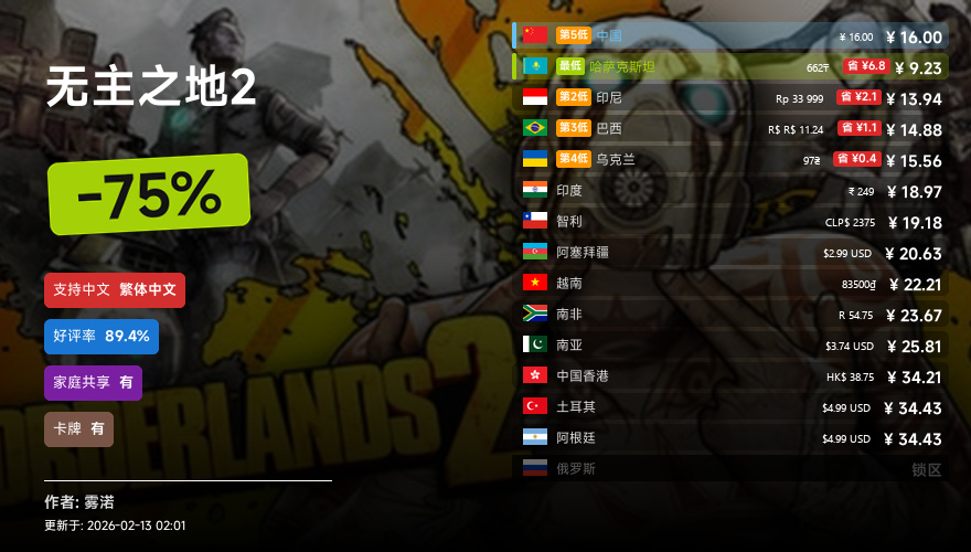 主要的地区为,国区,港区,乌区,哈区,俄区,南亚,印度,阿塞拜疆,阿区,土区,智利,巴西,越南,印尼,南非。这十五个地区的价格