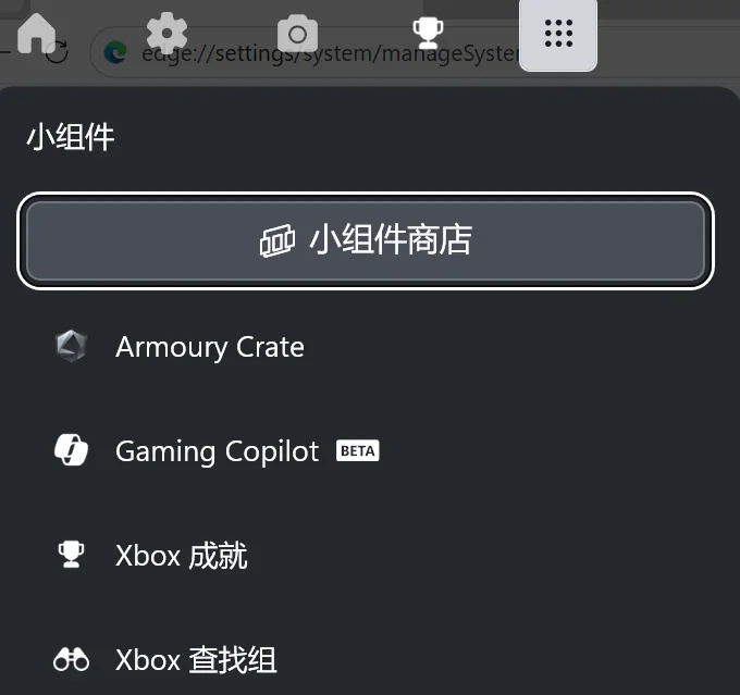 其次检查电脑是否安装GameBar,如果已经安装,Win+G打开,找到“小组件商店”,点击进入