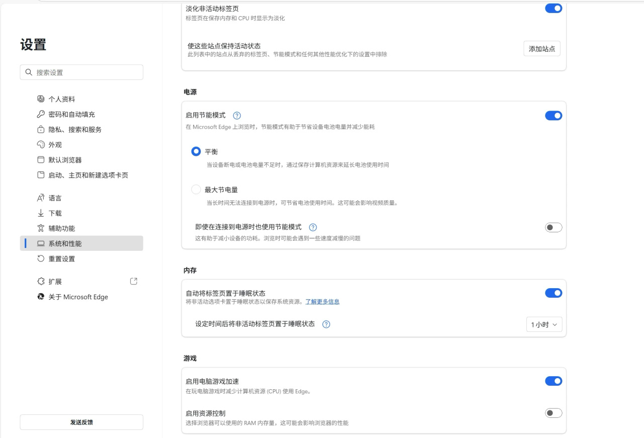 在游戏之外的设置,主要聚焦于PC本身的电源设置,和与Edge相关的设置。