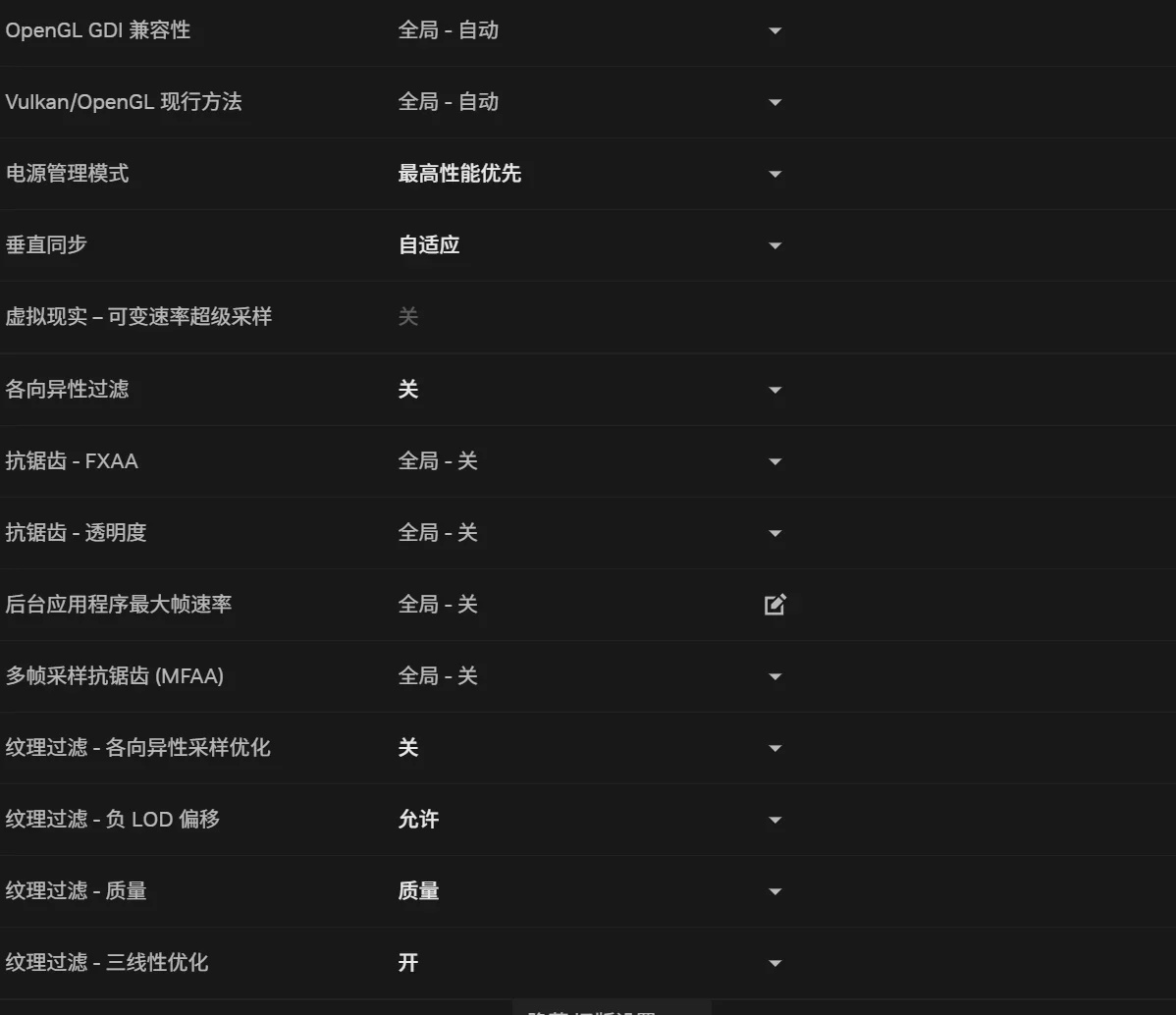 提前说明,个人因为测试过多种不同设置,在当前配置不启动光追感觉性能还有剩余,所以选择了使用NVIDIA滤镜追求更好的效果,个人体验比降低设置启动低光追效果更佳,达到了个人的预期。以下是我个人的设置: