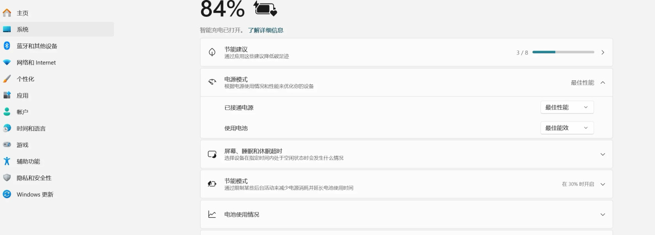 最后退出Edge和GameBar回到桌面,打开电脑设置,选择“系统”~“电源和电池”,确保接通电源时为“最佳性能”