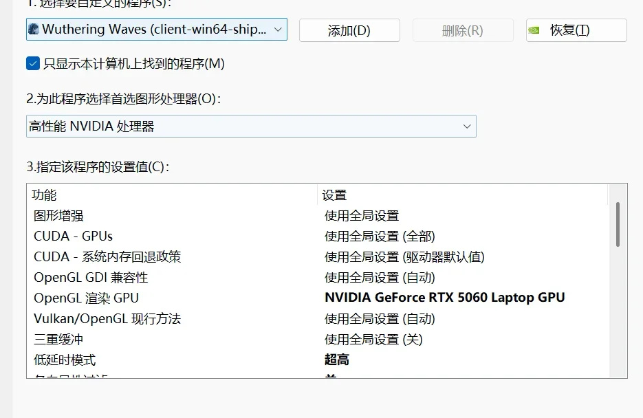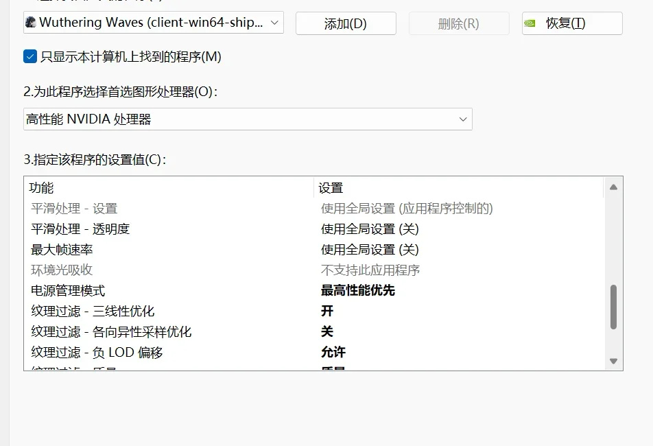 结束后,打开NVIDIA控制面板,管理3D设置~程序设置,点击“添加”,在列表中找到鸣潮(务必是Wuthering Waves不是中文,文件为Client-win64-Shipping.exe)。