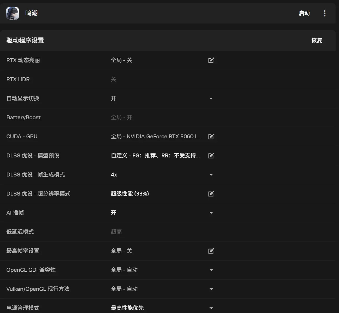 然后左侧“图形”,进行刷新,确保鸣潮出现在左侧列表,如果尝试无效可以添加扫描位置至游戏根目录。添加完毕后所有设置按照下方两图设置即可,配置低于5060的也可以基本照搬,性能差距我们在游戏内自行调整,配置更高的可以考虑调整DLSS优设。(其中DLSS优设的三项和AI插帧我会在图片下方作以解释)