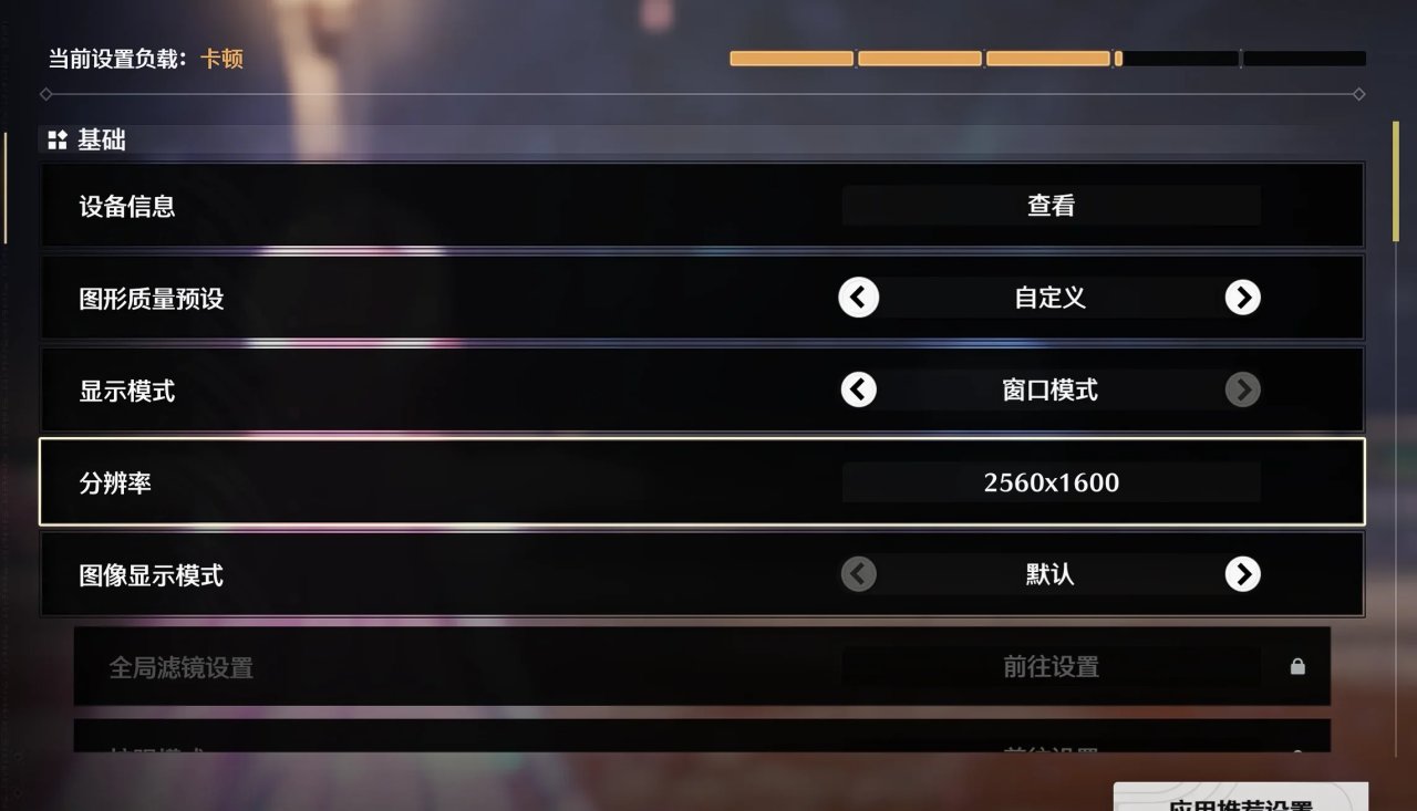 A.首先我们在图形质量预设先选择“平衡”,这点非常重要,根据个人尝试,后续所有设置基本都是基于图形质量预设选项的档位进行的,并非显示“自定义”就是真的自定义,即使后面设置完全一致,先选择“平衡”与先选择“画质优先”也有完全不同的性能压力需求。完成后分辨率选择2K,图形显示模式根据个人喜好设置,如果电脑配置较低,建议打开全局滤镜自行设置,如果和我同配,可以考虑同样使用NVIDIA滤镜