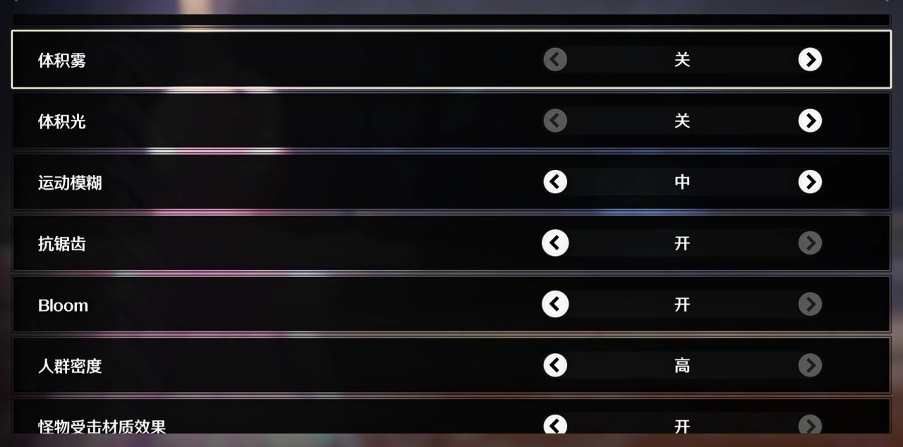 C.体积雾和体积光,是非常吃性能的,对于中低配的朋友完全不用开启,实际体验完全没有影响。运动模糊看个人,只有关和开对性能有影响,开都开了,选适合自己的就好。抗锯齿我选择打开,也有说法它会和驱动层有冲突但是个人体验了多个版本并没有感觉到。人群密度和之后的植被密度完全看个人,我的配置选择一高一中,我喜欢城市和场景热闹点,植被可以少一些。同时参考个人玩鸣潮和刺客信条影的体验,在大量植被前性能压力奇大无比,所以我还是选择了中植被。