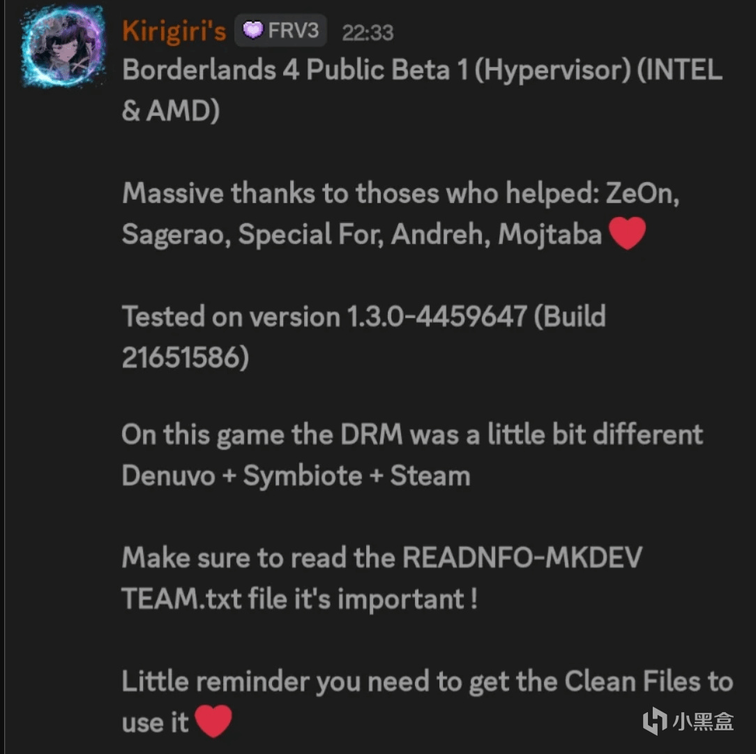 隨後,《無主之地4》也進入被突破名單,該作發售時間尚不足一年,依然部署Denuvo與2K自家Symbiote DRM及Steam保護的三重體系。Kirigiri利用Hypervisor完成連續繞過,使三層驗證結構同時失守,相關破解文件開始在多個渠道流通,原本封閉的運行環境被全面打開。