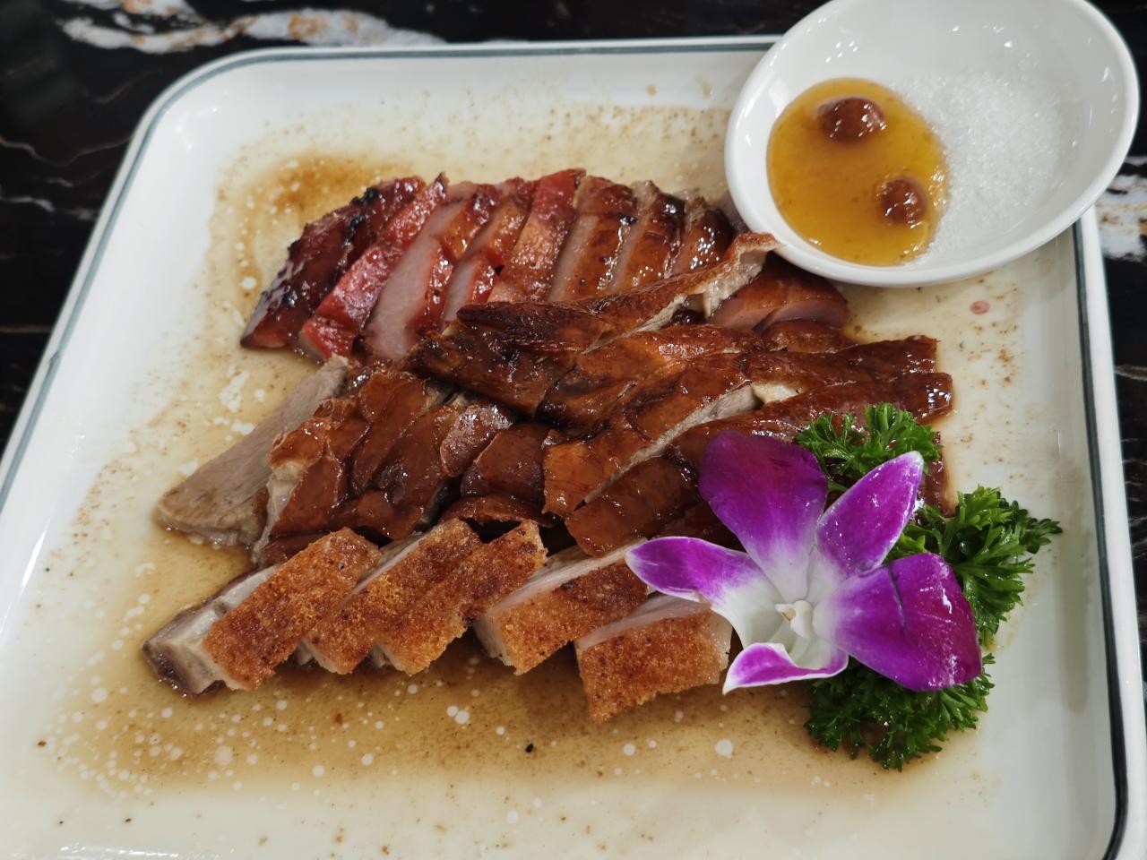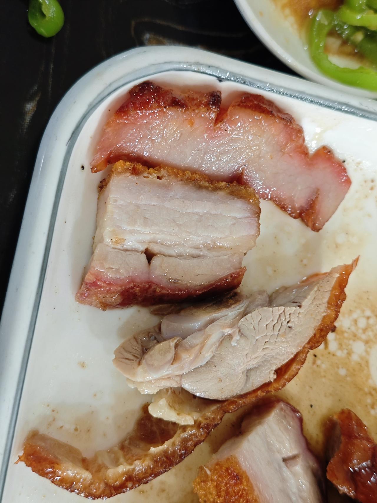 烧味三拼,真的是在太原到目前为止吃过的味道最好的烧腊,而且价格和分量也比较合适,整体来说性价比非常高。搭配的蘸料是山楂果酱,无论是空口直接吃还是蘸上果酱吃,味道都非常好。两种猪肉烧腊。吃起来都非常好吃,肉本身不肥,而且偏瘦,并不会有很腻人的情况。皮侧还有一些脆,更加增加了口感层次。五花烧鹅感觉比较难啃,有些略硬,但是皮很脆,整体吃起来还是很不错的