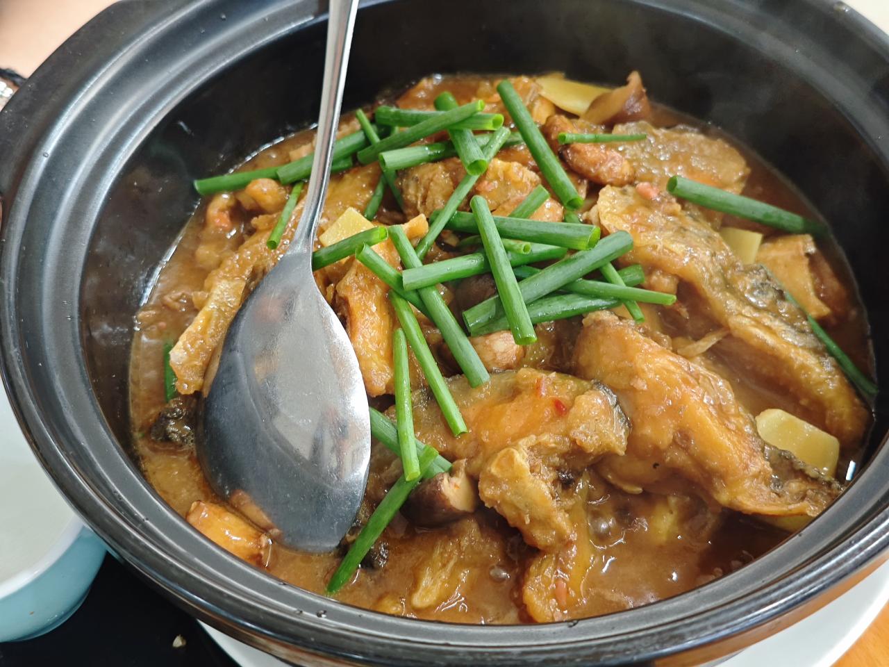 蒜子焖三文鱼头,三文鱼头是炸过的,且面衣略厚油味比较重比较腻,减脂人群注意。三文鱼头上实际上没有多少鱼肉,整体吃起来面衣和骨头占据的比例会更大一些,并且调味偏咸,个人觉得这道菜不是很推荐,只是套餐的一个填头。
