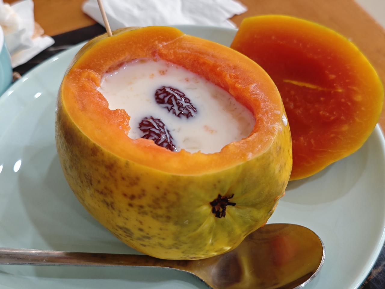 木瓜牛奶炖雪蛤,蒸木瓜味道清甜,牛奶中加有红枣和雪蛤,应该是放了砂糖,不然不会这么甜,作为饭后甜品真的太棒了。水果香与奶香混合,无论是大人还是孩子吃起来都很合适。