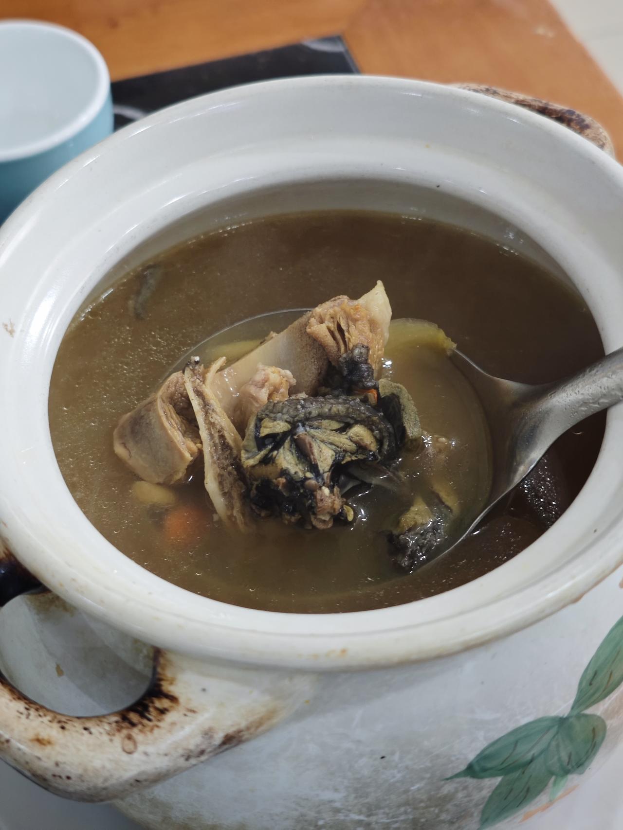 例汤:非常清淡,排骨乌鸡母鸡炖煮而成,汤汁非常清亮,有一股淡淡的甜味。鸡肉略有一点耐嚼。
