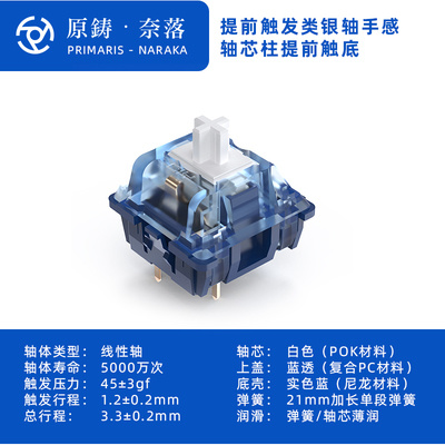 而爲了區分其區別,奈落的整體配色採用了藍色,上蓋由藍透的複合PC材料製成,軸心依舊採用白色POK材質,底殼則是換成了藍色的尼龍材料,方案同樣是三腳。將軸體拆開,內部潤滑依舊是老樣子,軸心同樣加長,並且採用的也是21mm單段彈簧。