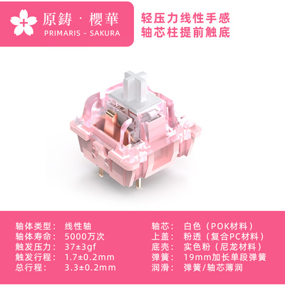 一說到櫻華就很容易想到同音的櫻花,而櫻花又恰好是粉色的,由此一來就明白櫻華是什麼軸體了(好像沒有類粉軸這一說法,不過市面上很多輕壓力軸體名字都帶粉),而作爲“櫻花軸”,配色也是按着櫻花做的。從圖中可以看到基本就是紅蓮換個顏色的版本,但實際也是不止這些差別的,直接上開箱環節: