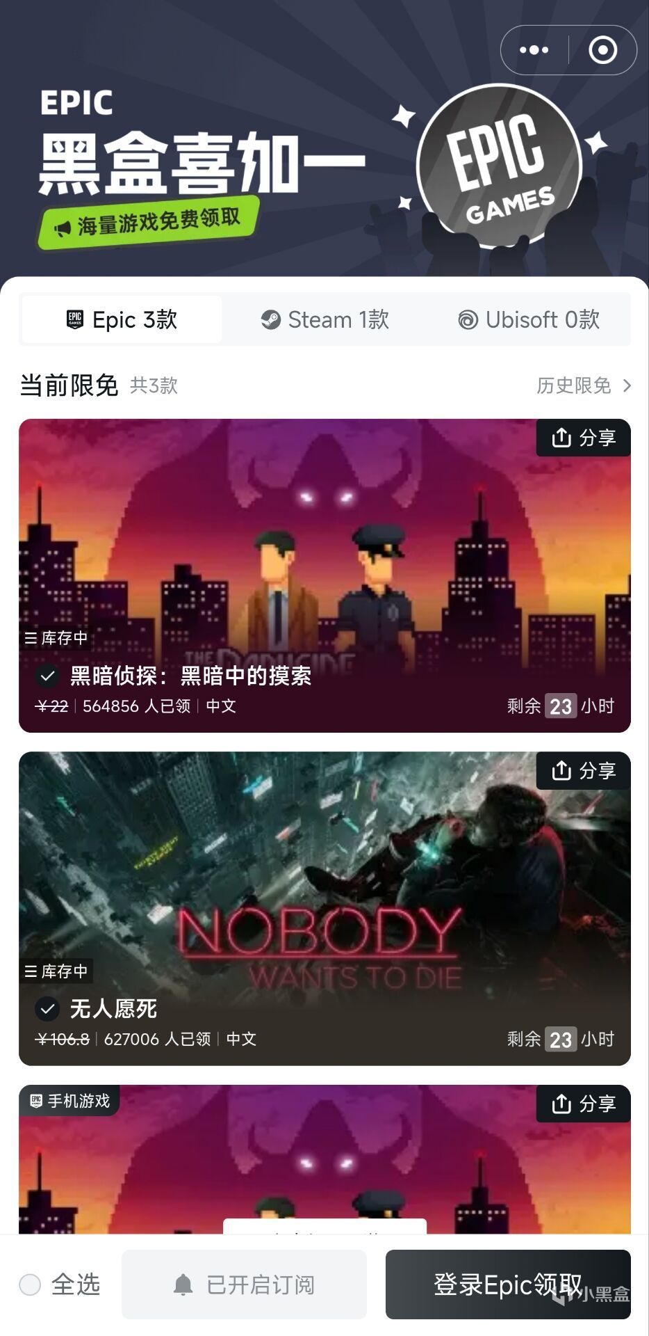 进入小黑盒——游戏库——点击喜加一点击登录EPIC领取。卡的话多试几次,出现错误退出来返回提交错误,选择更换线路,一般都是网络问题,不行挂个加速器。