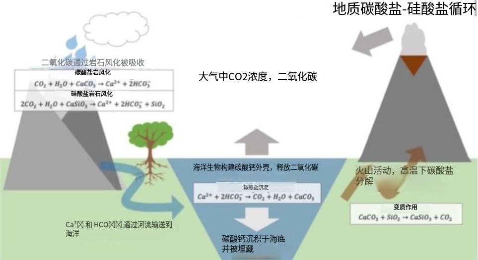 这是地球主要的无机碳循环,它在数百万年的时间尺度上改变着地球大气中的二氧化碳浓度 。
