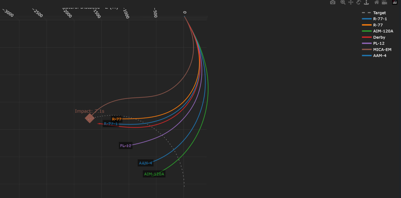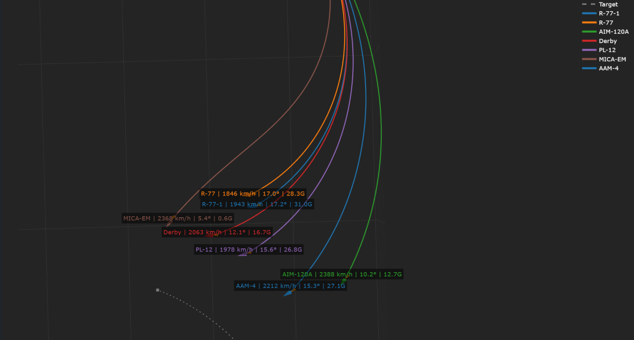 圖三爲低速下離軸能力對比:發射速度300km/h,靶機速度1200km/h,9G過載轉向,發射時離軸30°,發射時距離3000m除,米卡外均無法命中目標