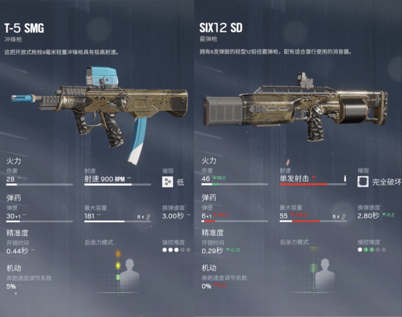 枪械介绍:T-5 SMG为高射速低后座的冲锋枪,手感优良,是综合性能较强的一把冲锋枪;SIX12 SD为港喷连喷,数值面板相当夸张,除了后坐力相对较大,几乎没有缺点。