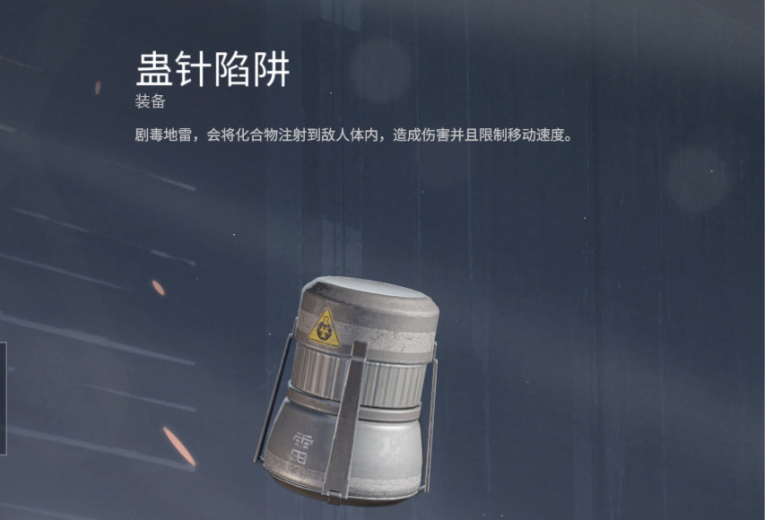 技能名称为“蛊针陷阱”。俗称“蛊”,为投掷部署的陷阱道具。