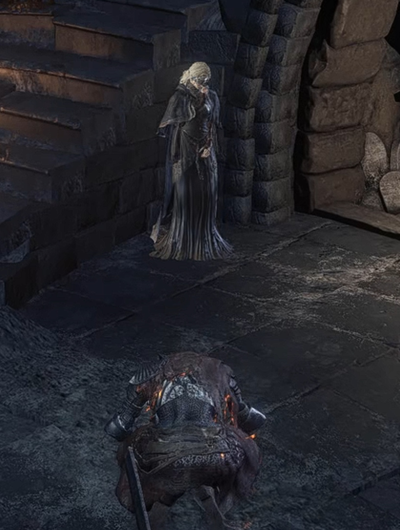 现在拉回玩家与防火女之间的经典互动,你在外经历痛苦、陷阱、死亡、拼杀最后割取回来的灵魂,你在采买法术、装备、武器之后,都会单膝跪在防火女面前,让她将这些灵魂转化为你身上的力量。