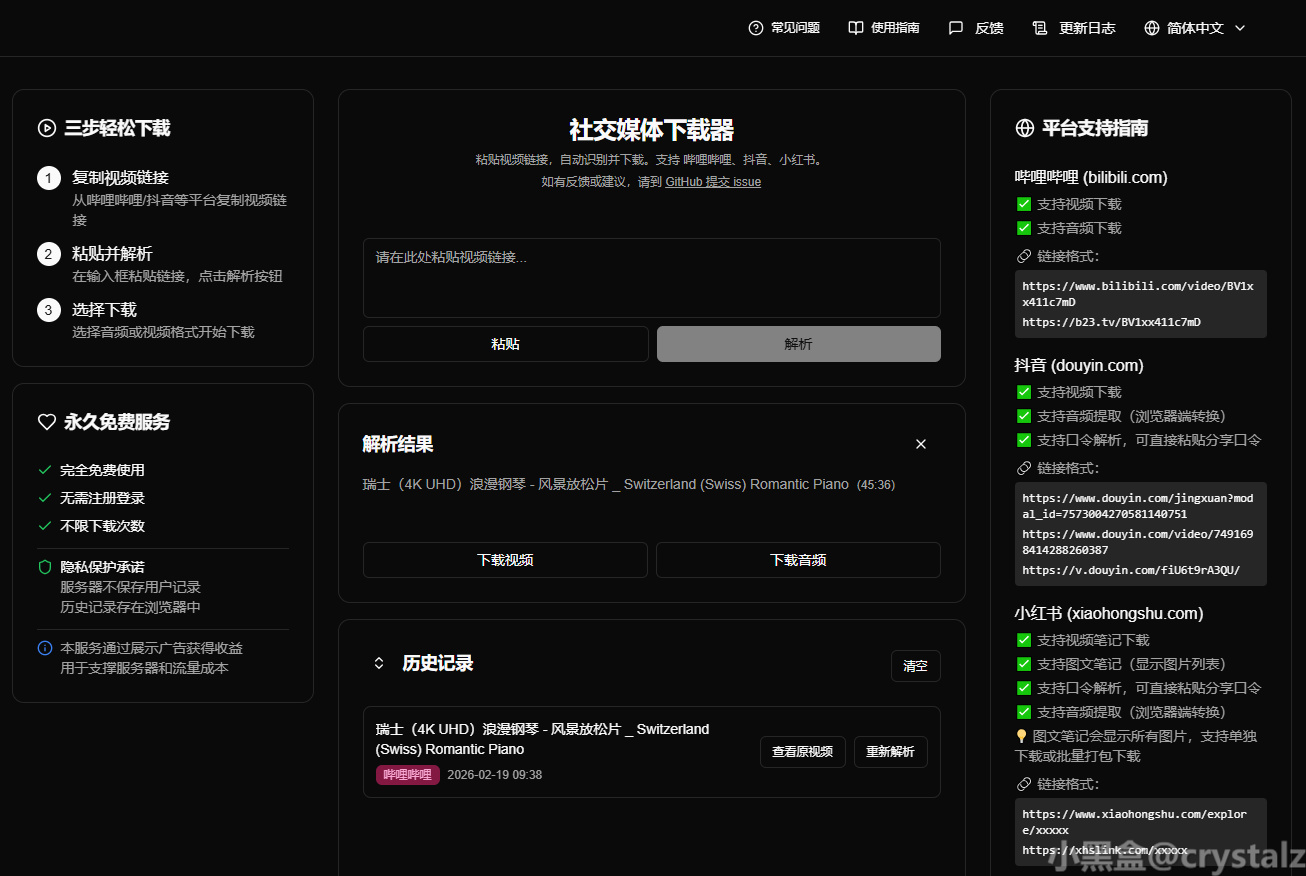 免費無門檻的多平臺視頻下載工具,支持 B 站、抖音、小紅書下載。