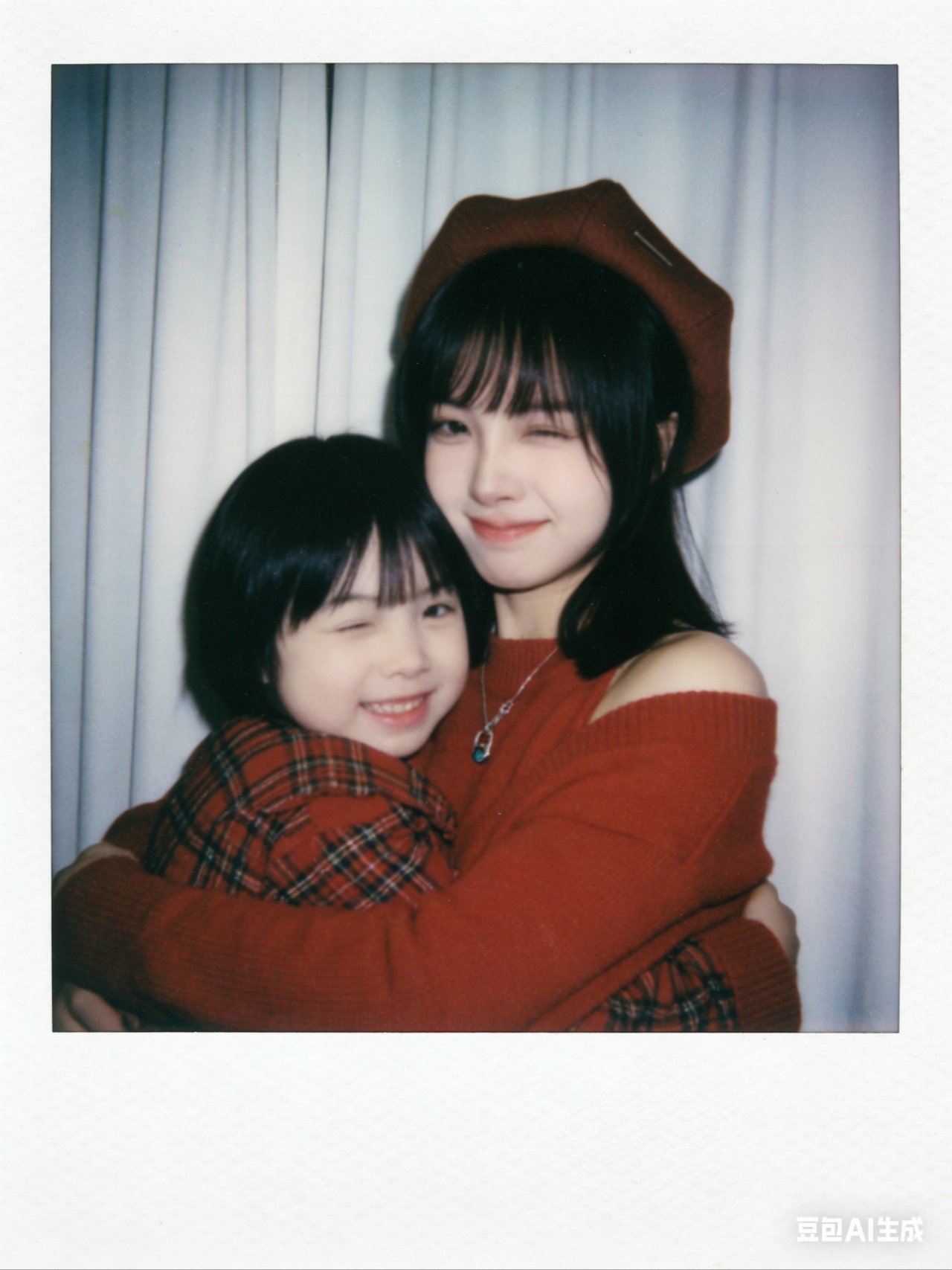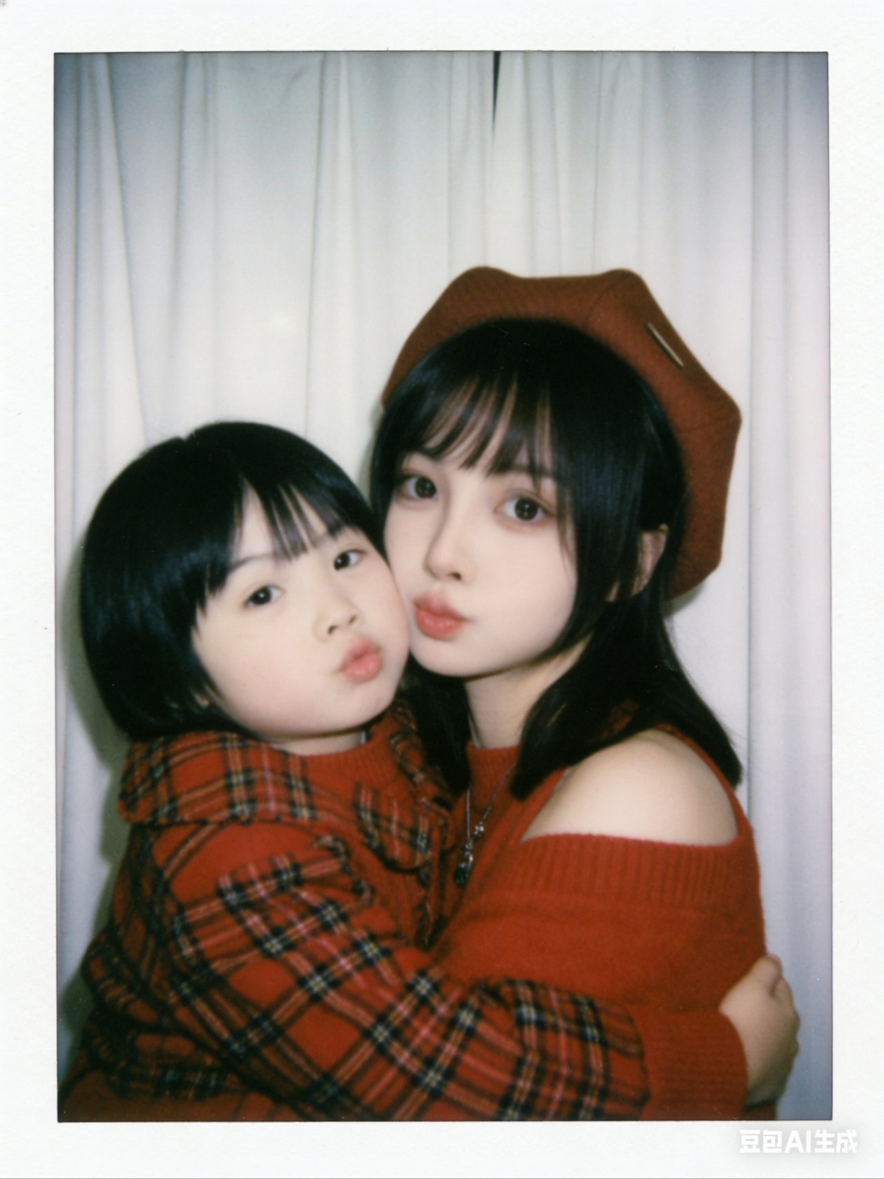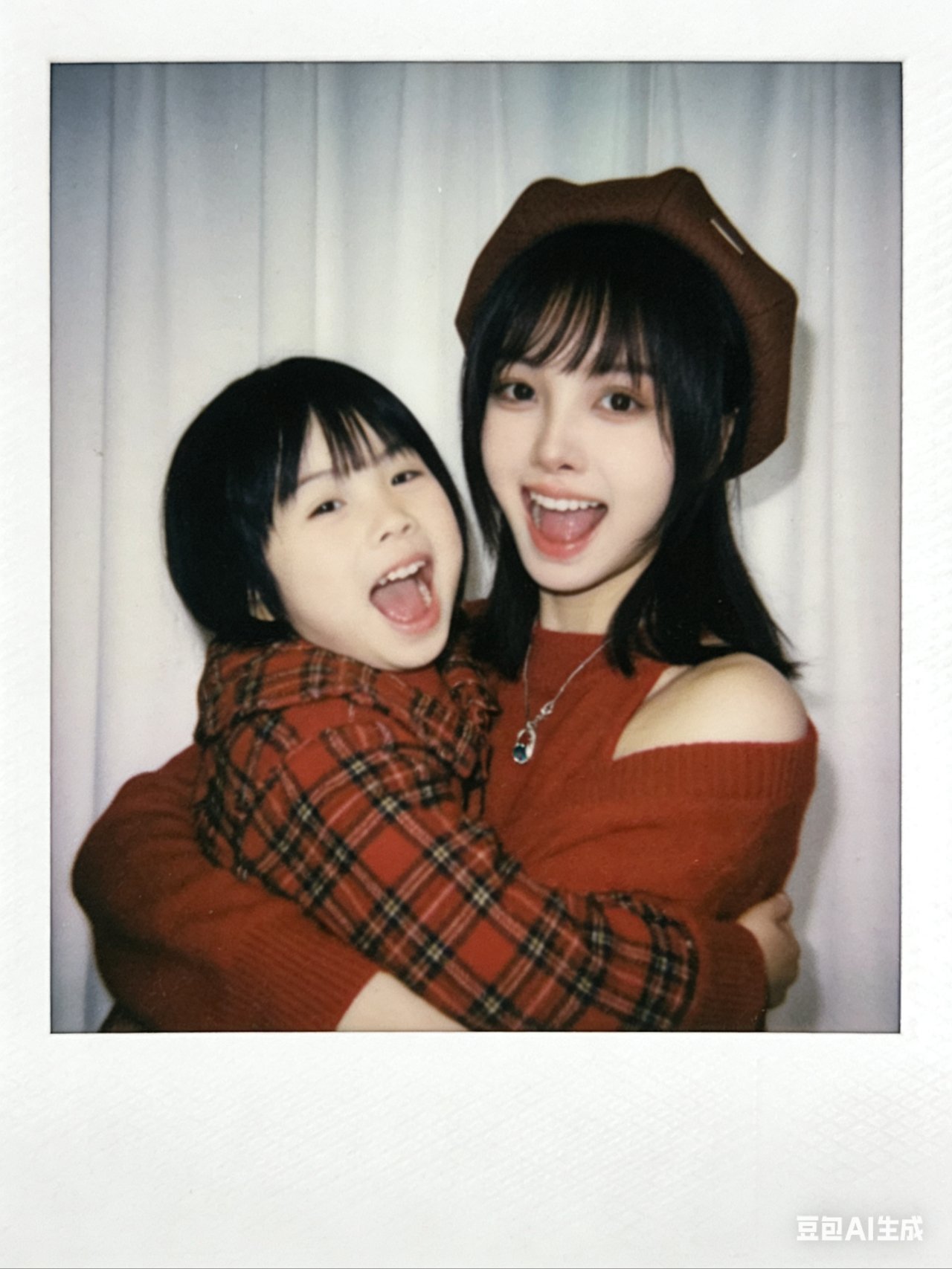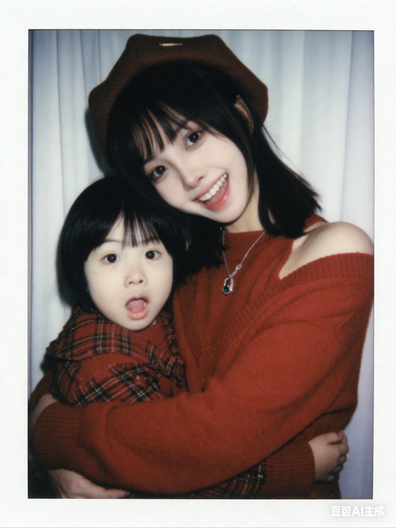 帮我生成九张不同表情不同姿势图片,两人要有拥抱互动,搞怪可爱的表情,温暖画面,搞笑的画面,1.画面主体:第一张图片抱着第二张图片小孩,面部细节完全保留,不做任何修改,与原照片面部一致;优先使用参考图中的衣服,保证服饰细节准确。2.背景设定:将人物背后背景替换为白色窗帘,窗帘质感自然,避免生硬拼接。3.风格与画质:整体呈现宝丽来相机拍摄效果,画面需有轻微模糊感,无明显清晰焦点;光线为暗室闪光灯效果,光源均匀散射在整个画面中,亮度一致且柔和,画面整体清晰度一致,不要过度锐化脸部。4.其他要求:画面无明确额外主体或杂物,风格贴近普通日常照片,不添加多余装饰元素,比例3:4。
