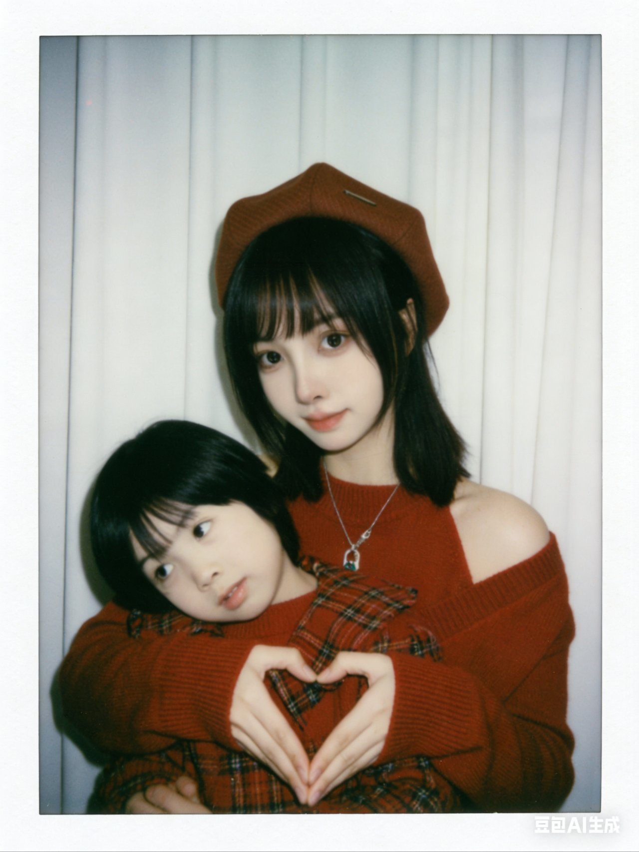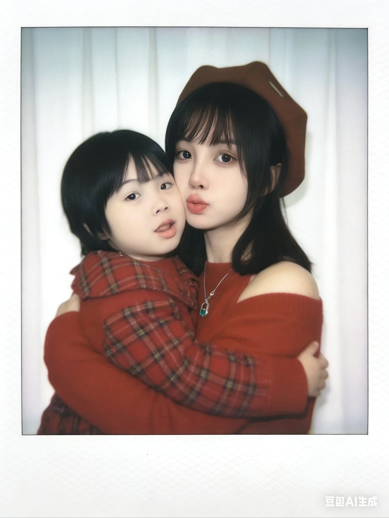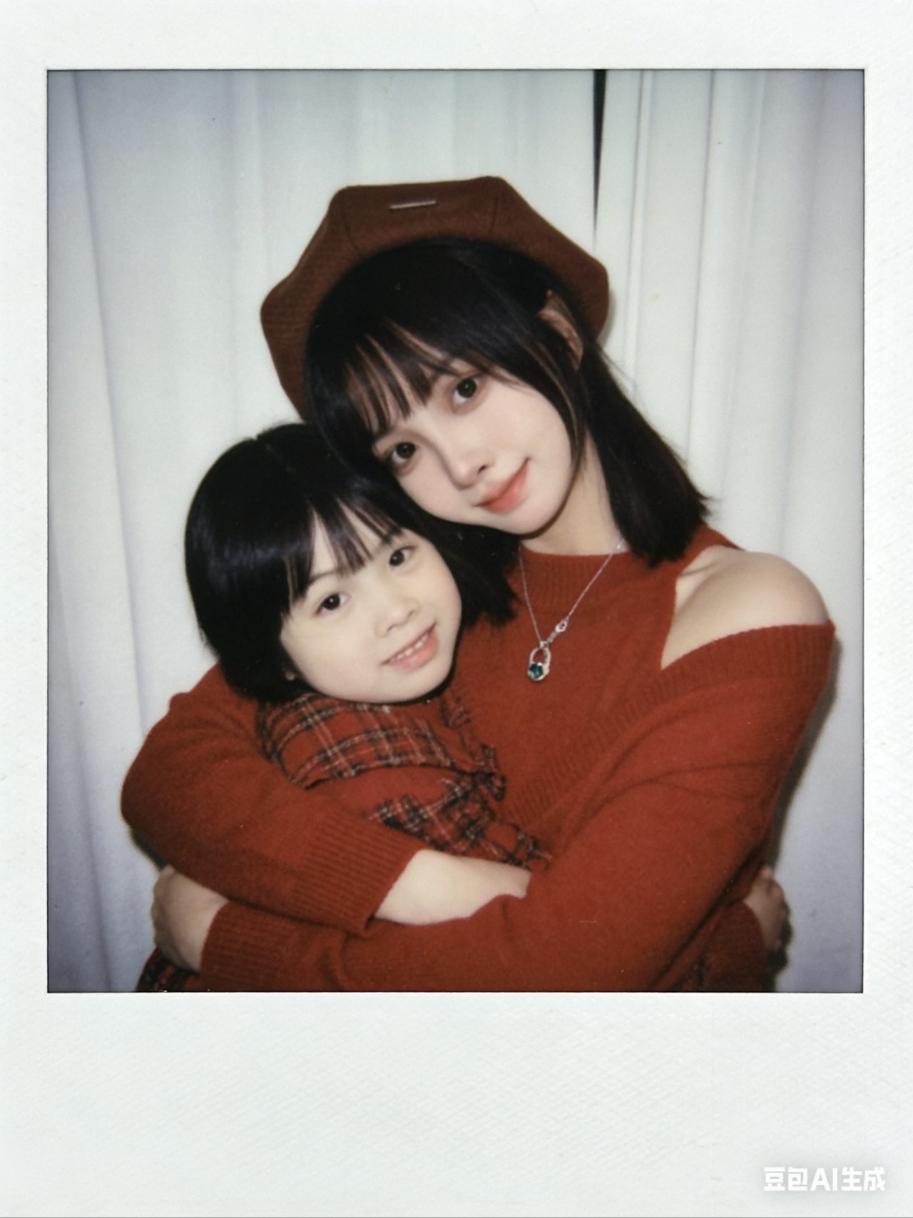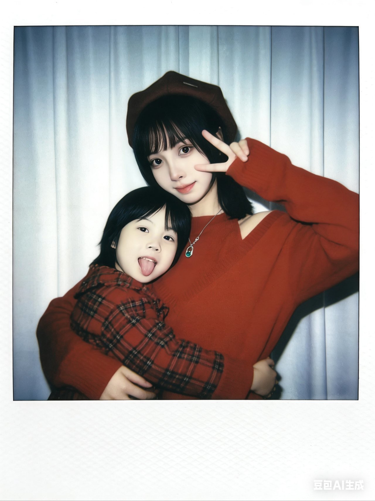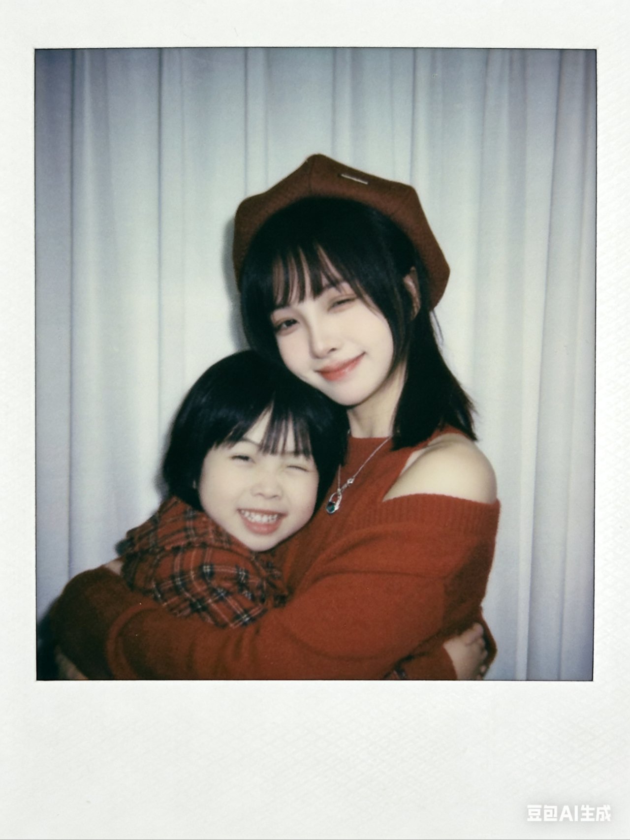 帮我生成九张不同表情不同姿势图片,两人要有拥抱互动,搞怪可爱的表情,温暖画面,搞笑的画面,1.画面主体:第一张图片抱着第二张图片小孩,面部细节完全保留,不做任何修改,与原照片面部一致;优先使用参考图中的衣服,保证服饰细节准确。2.背景设定:将人物背后背景替换为白色窗帘,窗帘质感自然,避免生硬拼接。3.风格与画质:整体呈现宝丽来相机拍摄效果,画面需有轻微模糊感,无明显清晰焦点;光线为暗室闪光灯效果,光源均匀散射在整个画面中,亮度一致且柔和,画面整体清晰度一致,不要过度锐化脸部。4.其他要求:画面无明确额外主体或杂物,风格贴近普通日常照片,不添加多余装饰元素,比例3:4。