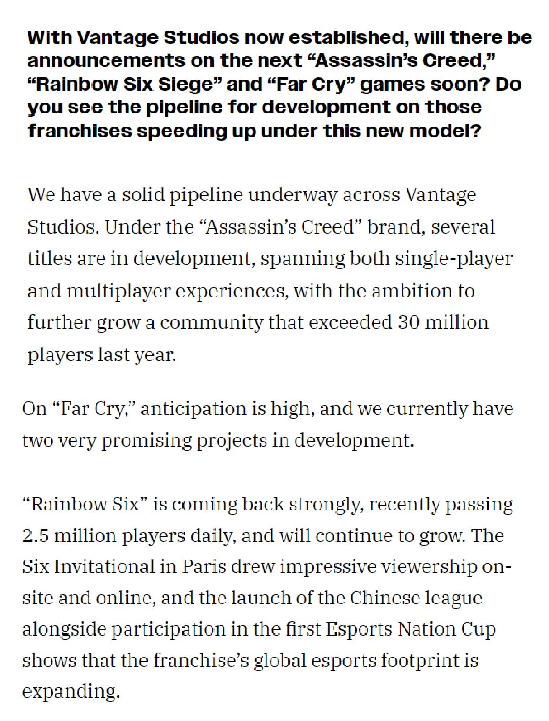 “《彩虹六號》勢頭強勁,近期日均玩家數已突破250萬,並將繼續保持增長。在巴黎舉辦的國際邀請賽吸引了大量觀衆,同時,中國聯賽的啓動以及戰隊首次參與電競國家杯,都標誌着該系列在全球電競領域的影響力正在不斷擴大。”