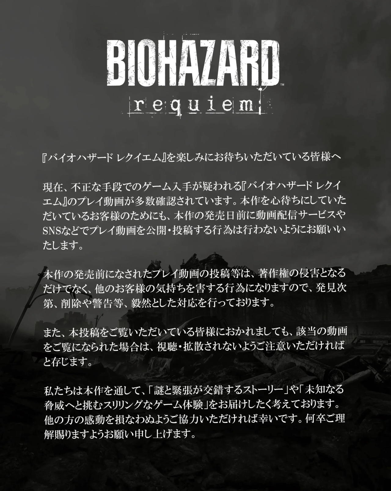 为了那些同样期待本作的玩家,恳请您不要在游戏发售日前,于视频网站或社交媒体等平台公开、上传游玩视频。