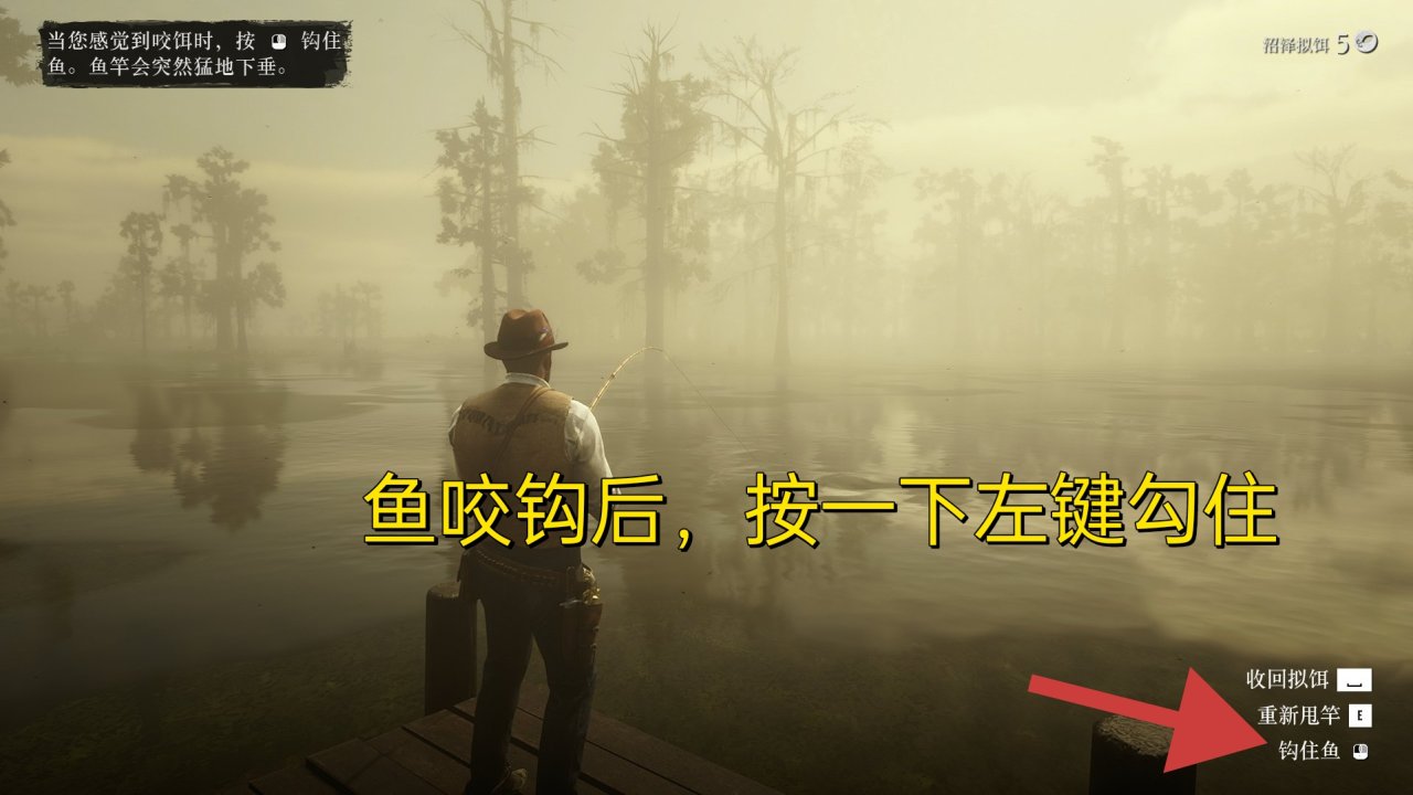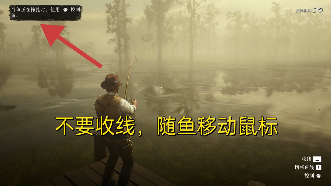 2. 當魚咬鉤後,右下角左鍵亮起,按一下勾住魚,此時鬆開左手,不要收線。剛勾住時,魚會掙扎,收線容易斷。僅用鼠標控制,左右移動,魚往那邊就往那邊動