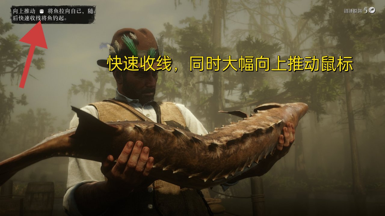 3. 觀察水面,當魚停止掙扎時,左手立刻按住空格,快速點按R收線,同時右手大幅度向上推動鼠標,就可以輕鬆釣魚。⭐注意,在此過程中魚會多次掙扎,一旦開始掙扎,鬆開鍵盤,只用鼠標控制方向。