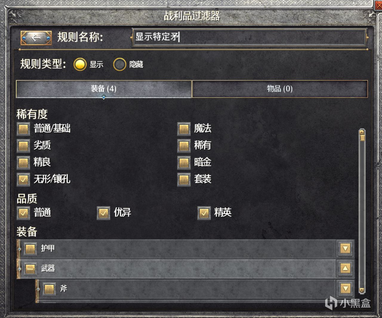 ⼀个是⿊名单,⼀个是⽩名单,看你喜欢哪种。不过有的⼩伙伴会发现我上⾯截图的规则中,最后并没有显⽰全部物品的规则。这是因为假如你不在规则中⼿动指明屏蔽全部物品,那么系统默认是显⽰全部物品的, 原因还是上⾯说到的,过滤器是运⾏在显⽰物品规则之上的。