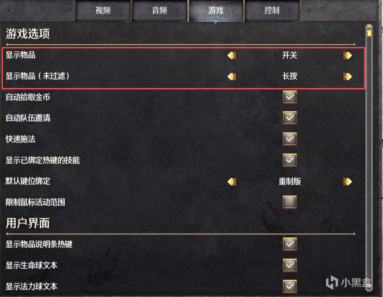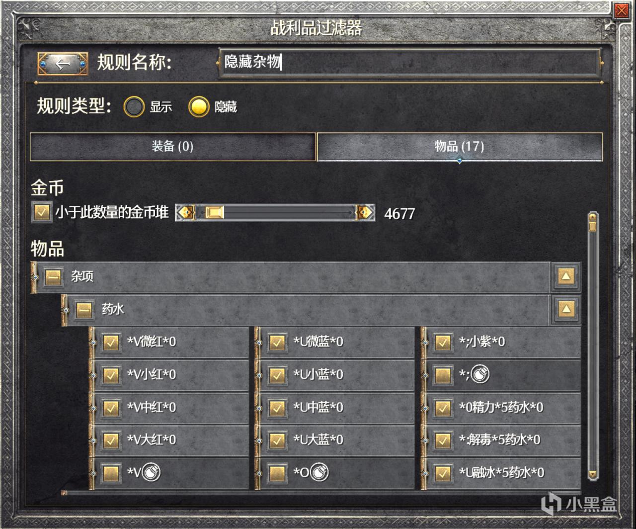 与装备规则不同,物品这⾥就简单了,⼀个是屏蔽特定物品,⽐如药⽔、宝⽯、钥匙,⼀个就是⾦币。⾦币这个只是不显⽰了,站上去依旧会⾃动拾取。