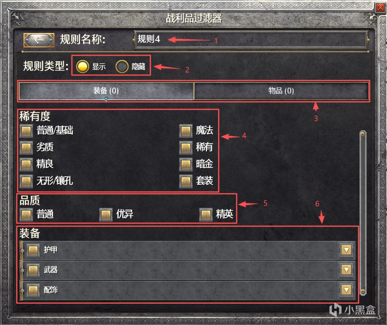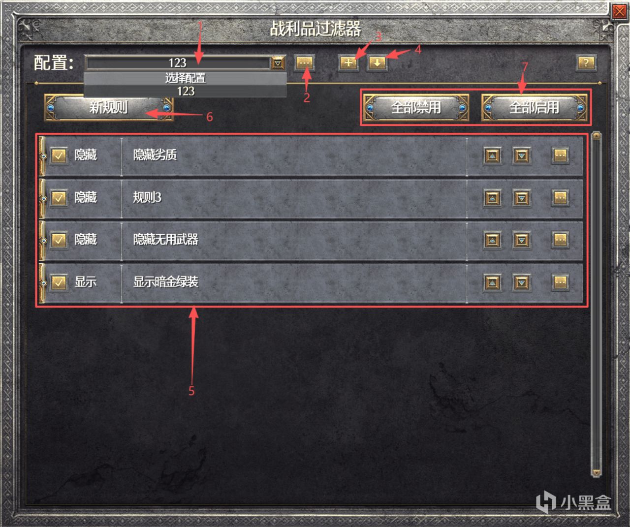 我们会发现每个过滤配置下存在多条规则,在激活(即选中对应配置)配置前提下,按照从第⼀条规则依次向下执⾏,假如碰⻅不在规则中的掉落,则按照默认显⽰规则执⾏。