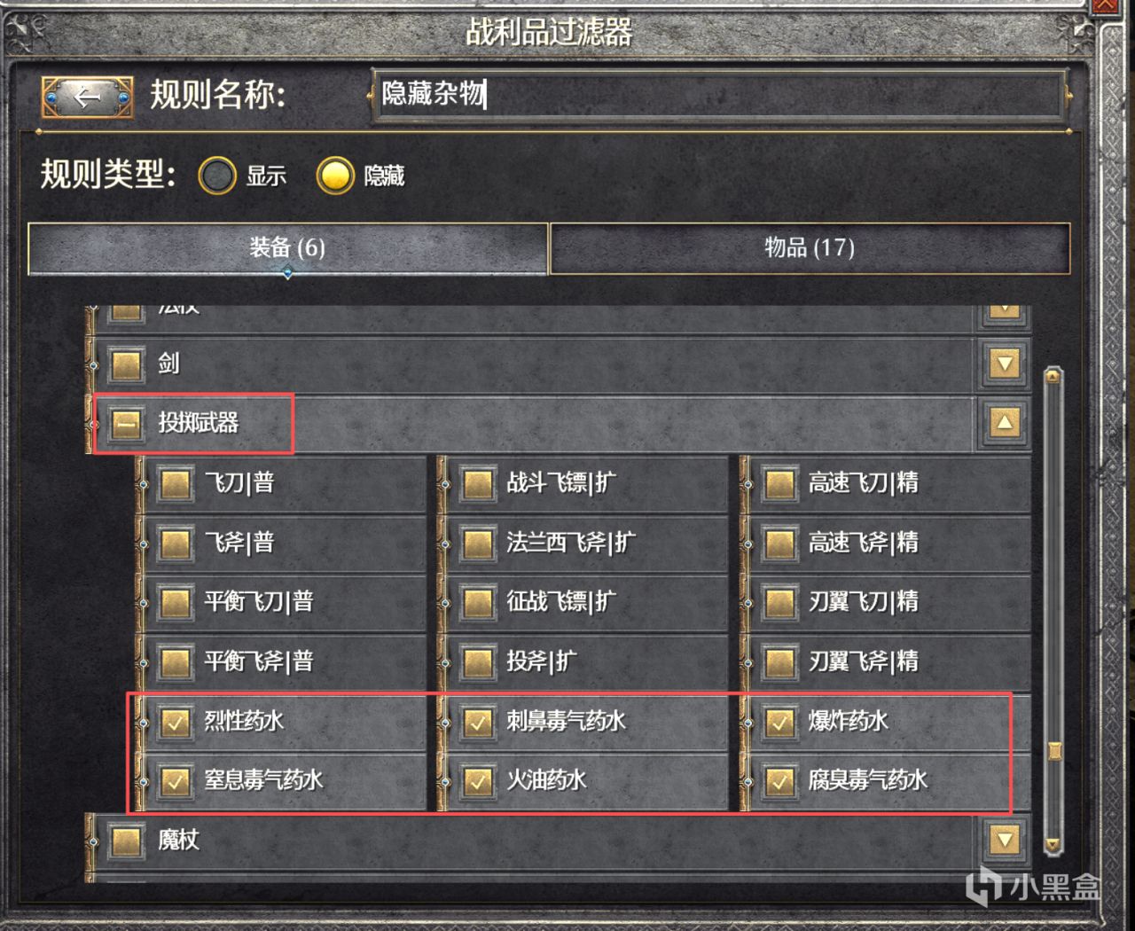 这⾥需要再额外提另外⼀点,就是毒药⽔、⽕药⽔这些,游戏⾥判定不是物品,⽽是投掷武器,需要去装备-武器-投掷武器下⾯勾选