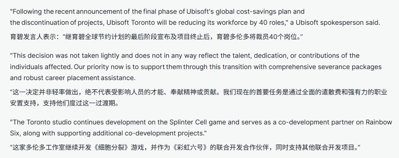 "随着育碧全球成本节约计划最终阶段公布及多个项目终止,育碧多伦多工作室将裁减40个职位,"发言人表示,"此项决定绝非轻率之举,绝不反映受影响员工的才能、贡献与敬业精神。当前首要任务是通过全面的离职补偿与完善的职业安置支持,协助他们度过过渡期。"