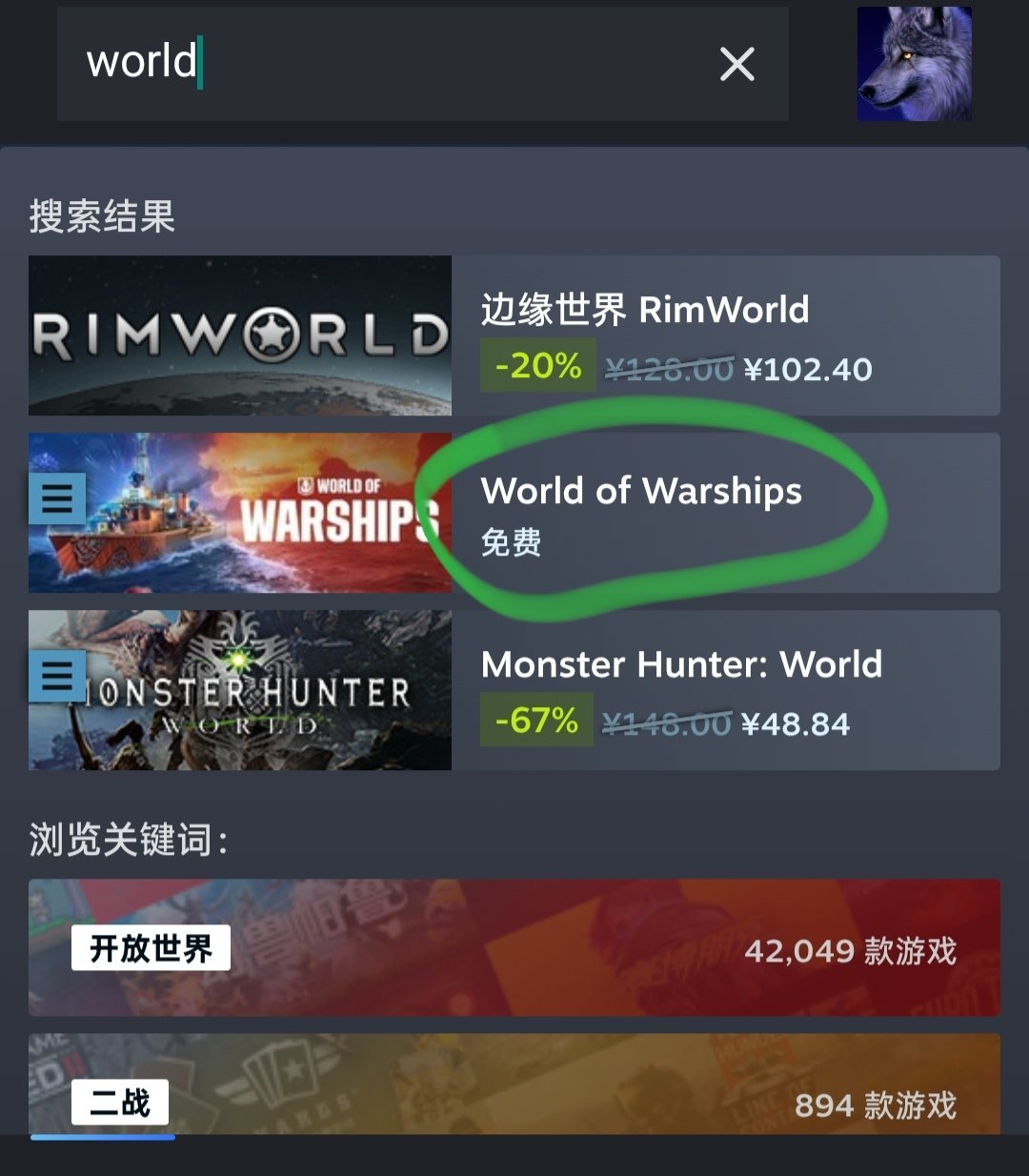 本次領取的是戰艦世界,坦克世界這些的直播間點數物品,所以我們在steam搜索world,就可以看到下面幾個,我這個畫圈的是戰艦世界的,點擊進去